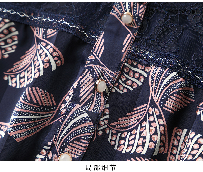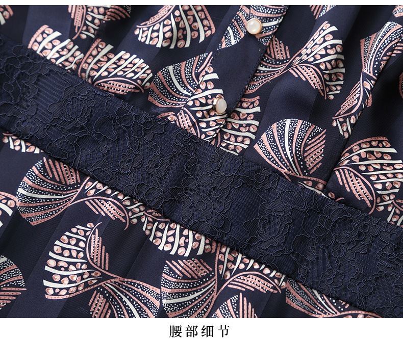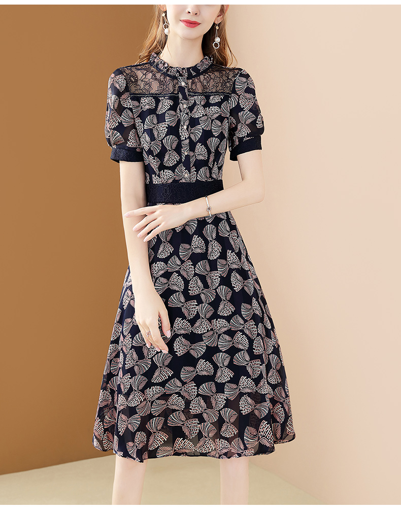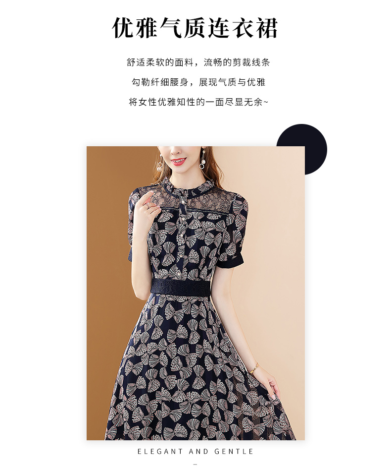 茗思氣質雪紡泡泡袖連衣裙女夏季2023新款優雅蕾絲撞色顯瘦印花裙