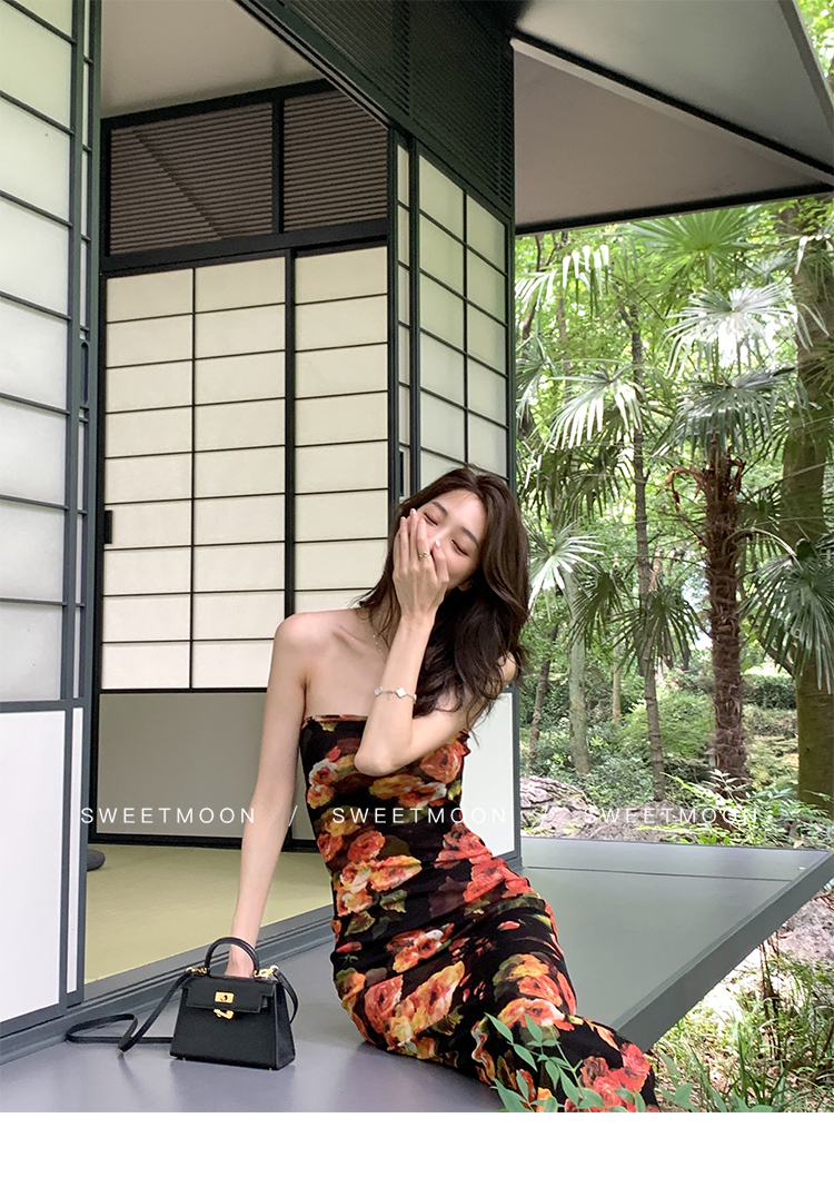 剁椒sweetmoon玫瑰花事/法式印花網紗修身裹胸包臀小眾連衣裙女夏