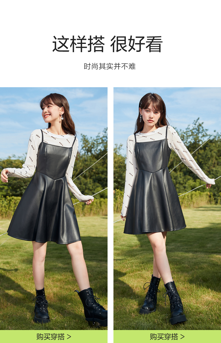 森馬吊帶連衣裙女少女感甜酷小黑裙2023秋季新款小個子pu仿皮傘裙