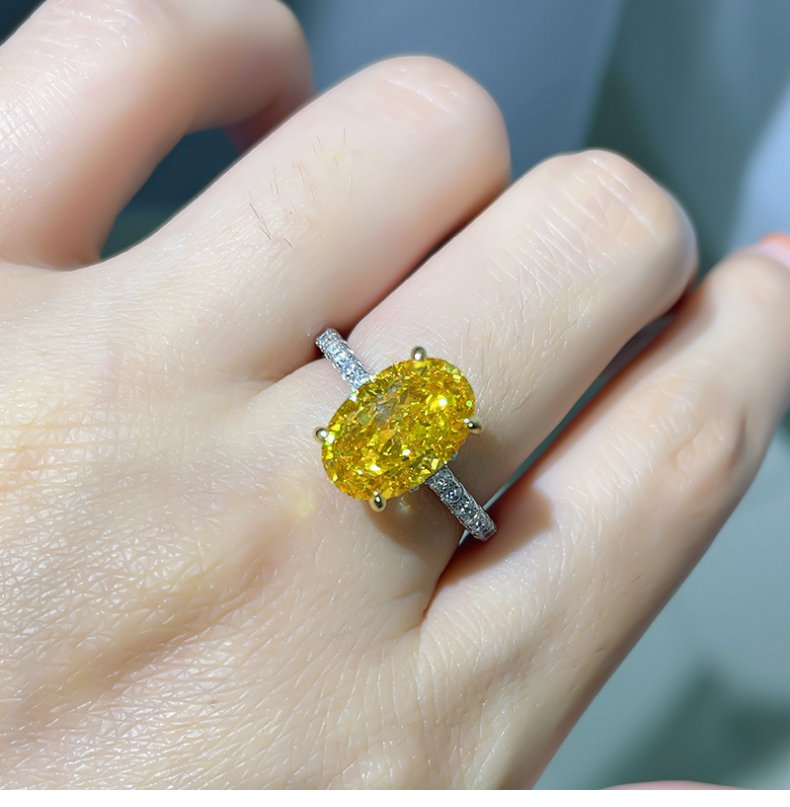 s925 純銀鍍金高級橢圓黃鉆四爪鉆戒女時尚個性食指指環 手飾品