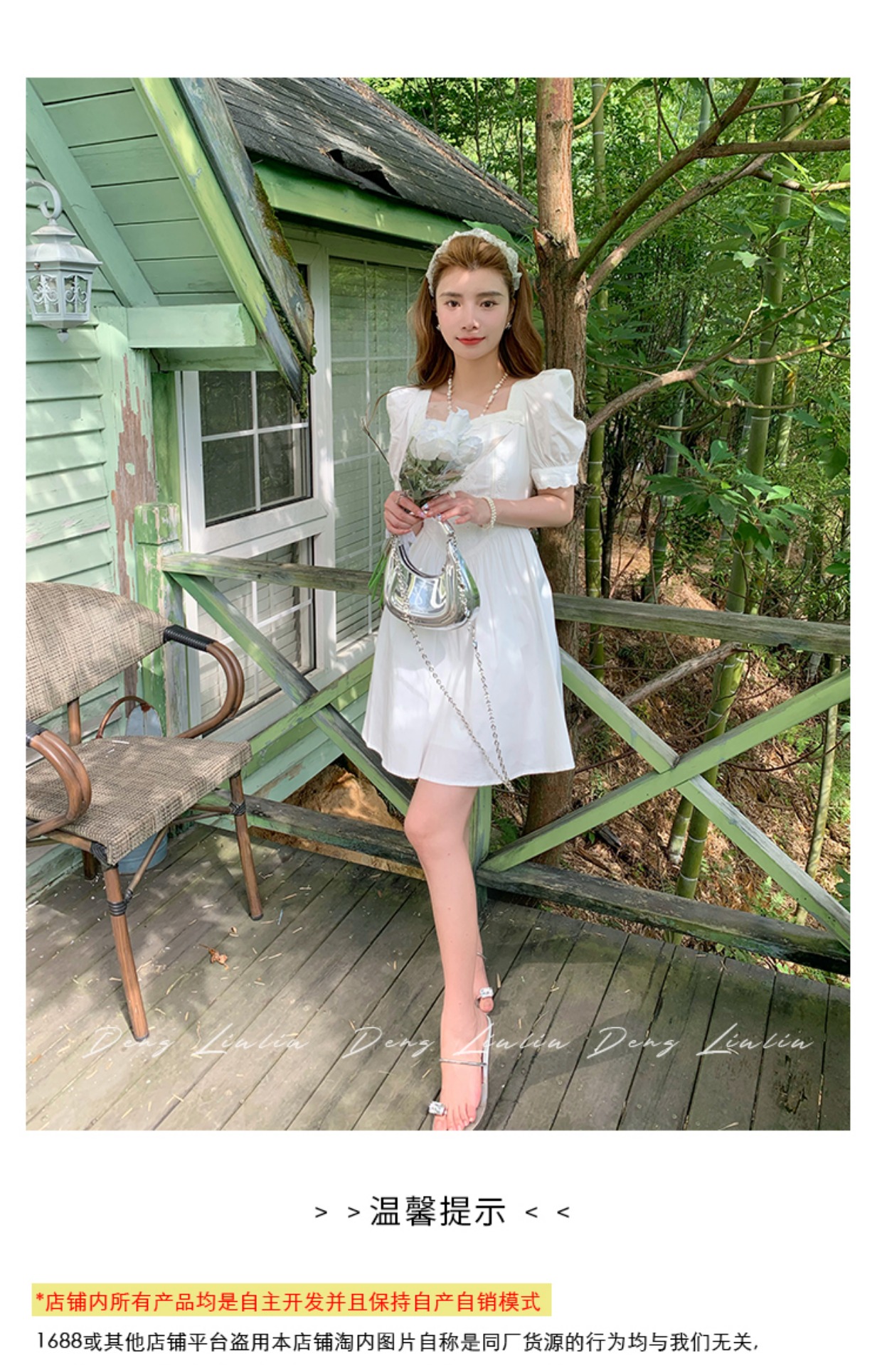 鄧六六白色連衣裙女夏法式初戀感方領收腰顯身材長裙子領證小白裙
