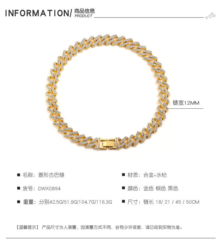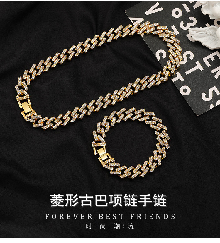 歐美高端大氣滿鉆嘻哈古巴鏈合金菱形鑲鉆滿鉆古巴項鏈男士大金鏈