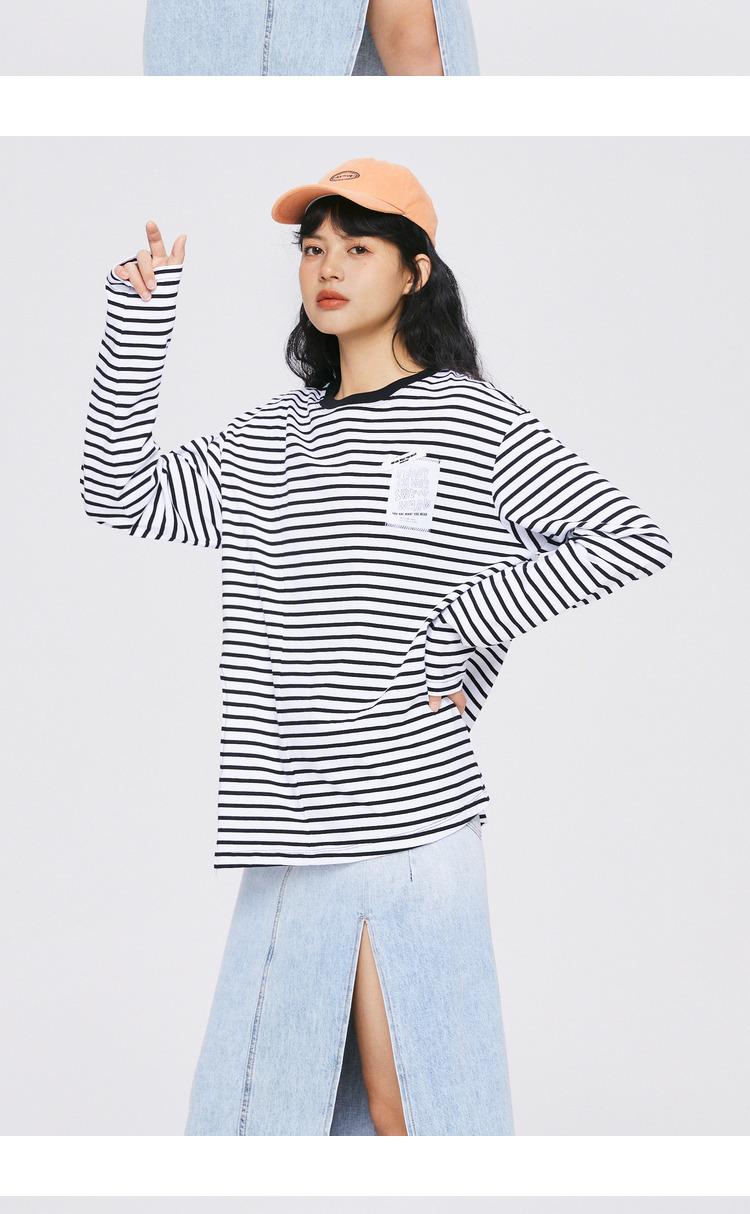 森馬長袖T恤女純棉寬松上衣2023秋季新款小個子黑白條紋打底衫薄