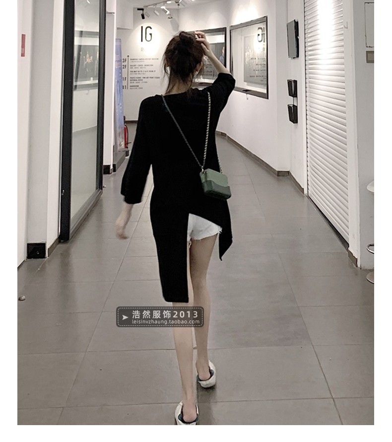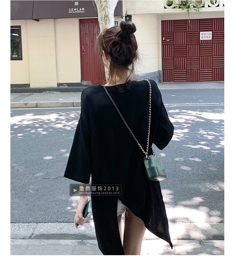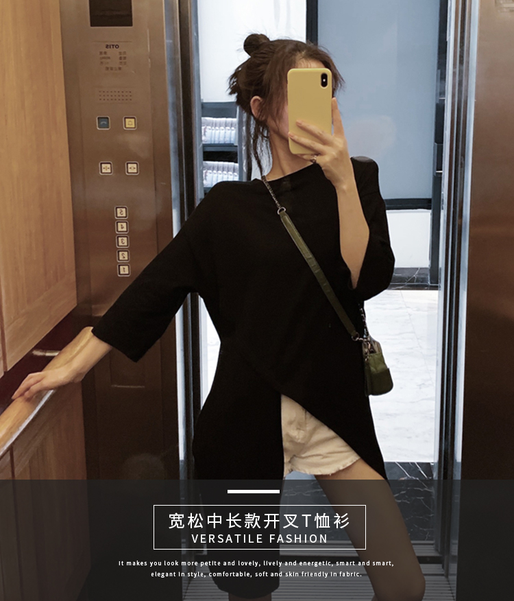 大阪T恤女裝夏季新款7分袖開叉下擺不規則大碼寬松莫代爾黑色上衣