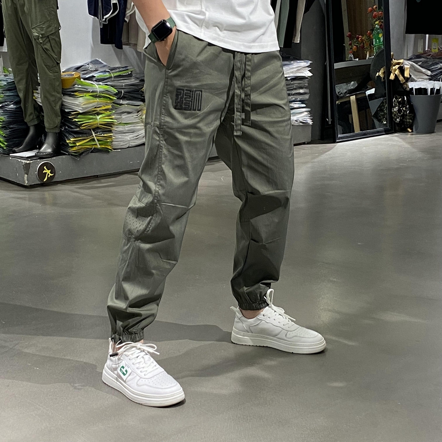 夏季薄款工裝褲男潮牌寬松休閑束腳運動褲青少年軍綠色口袋哈倫褲