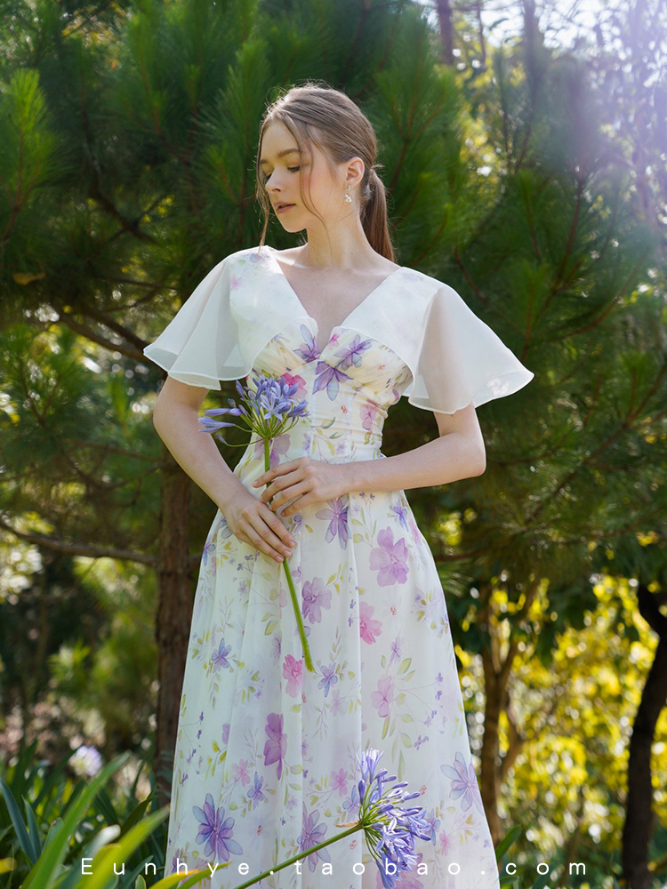 越南小眾DARLIN DIVA2022夏季新款喇叭短袖V領甜美香芋紫長裙淑女