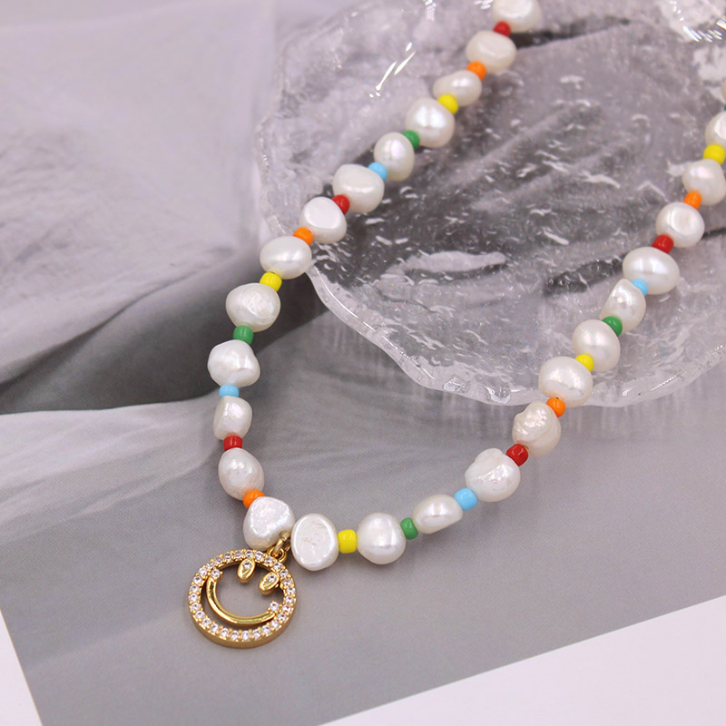 彩虹串珠巴洛克異形不規則天然淡水珍珠笑臉項鏈甜酷鎖骨鏈女夏季