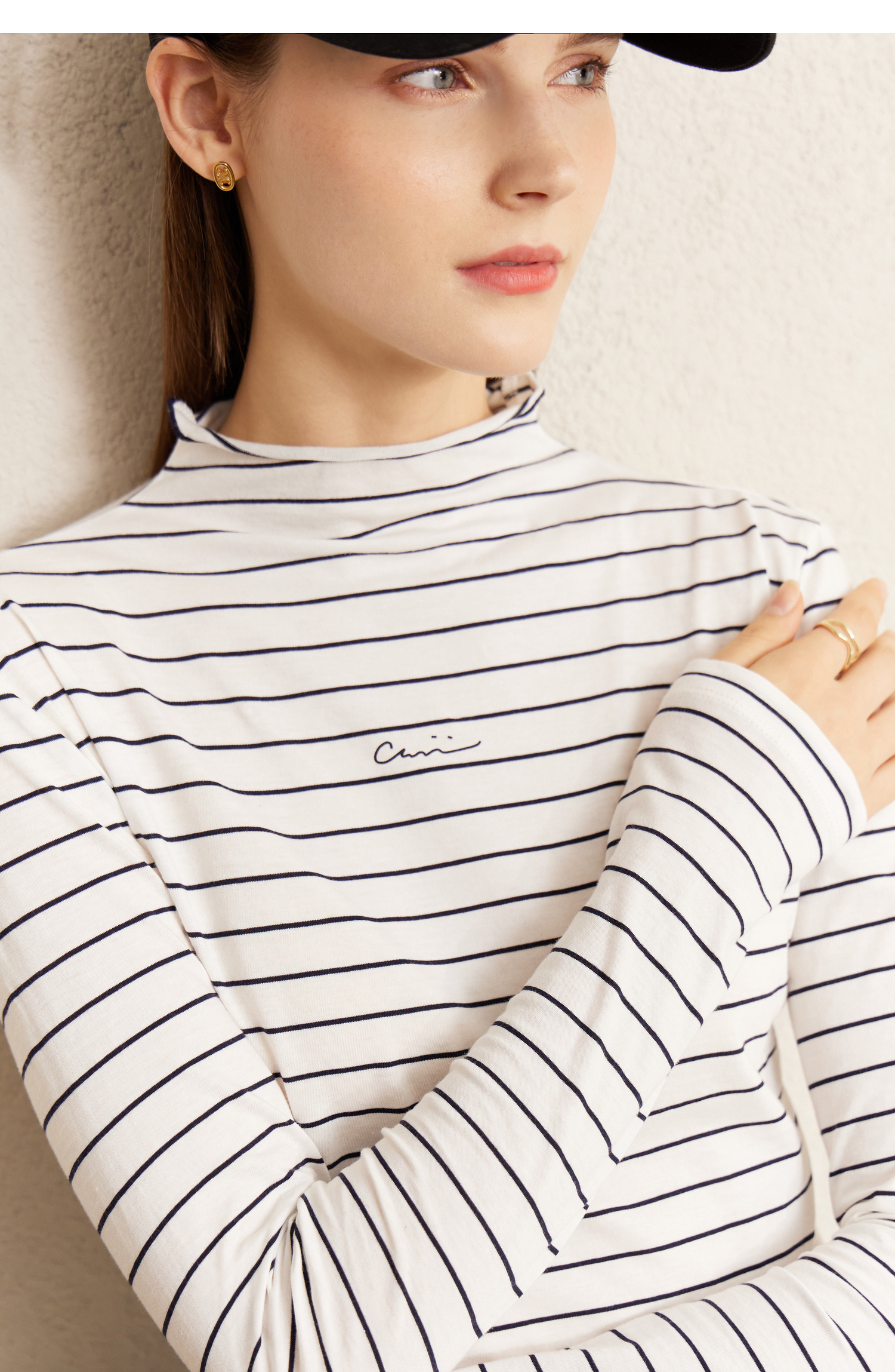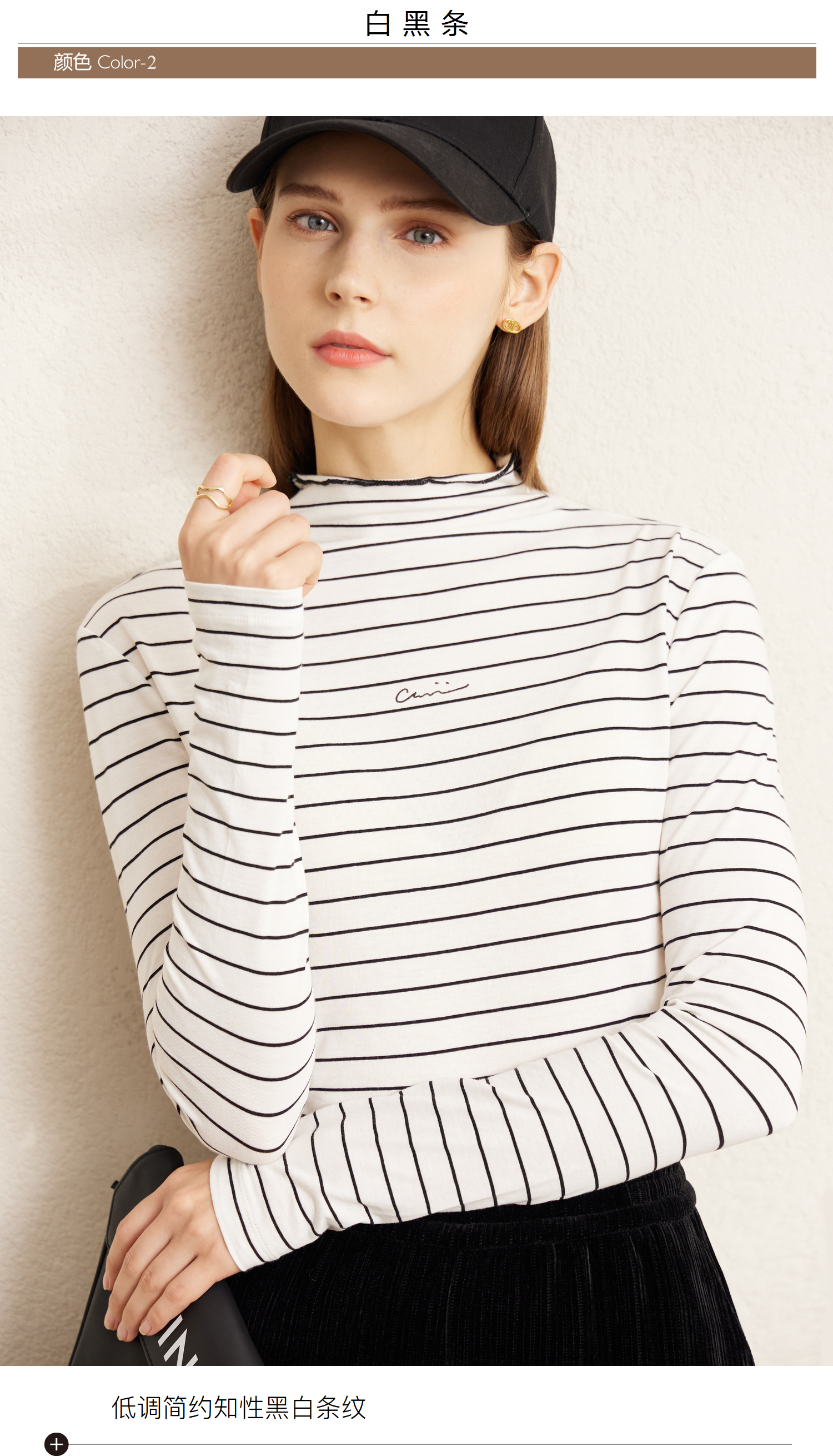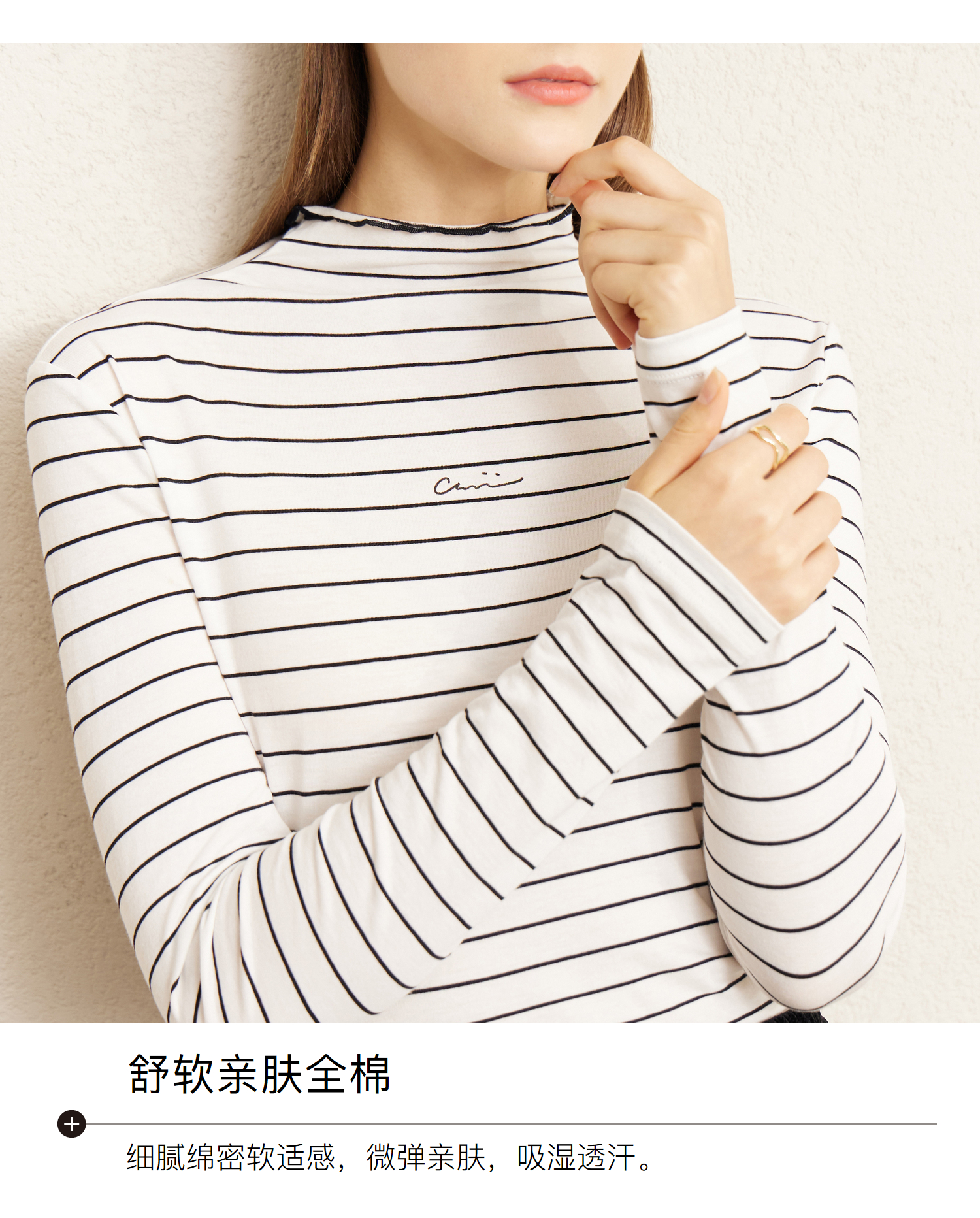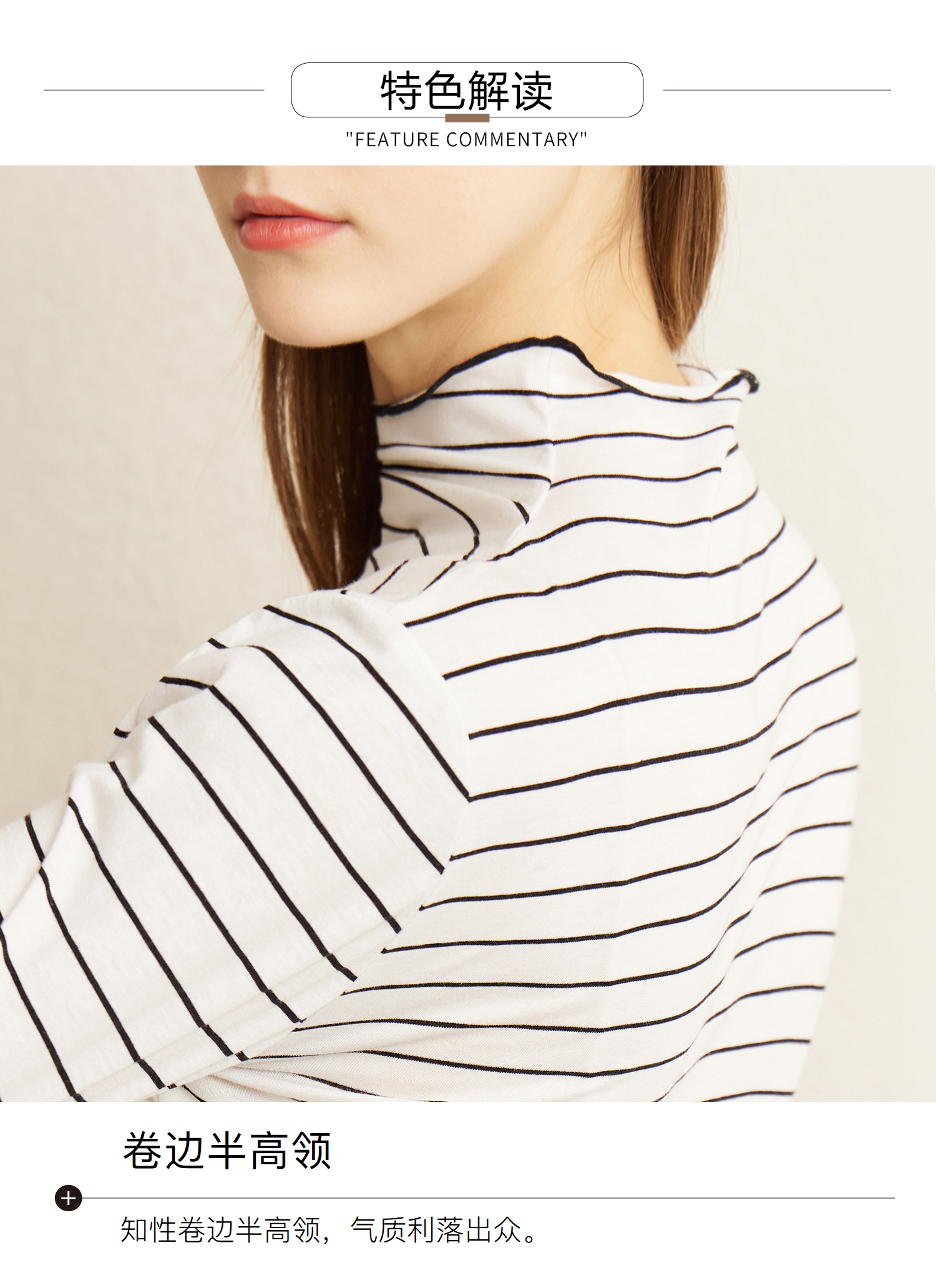 Amii2022秋裝新款修身百搭打底衫T恤半高領細條紋全棉間條上衣女