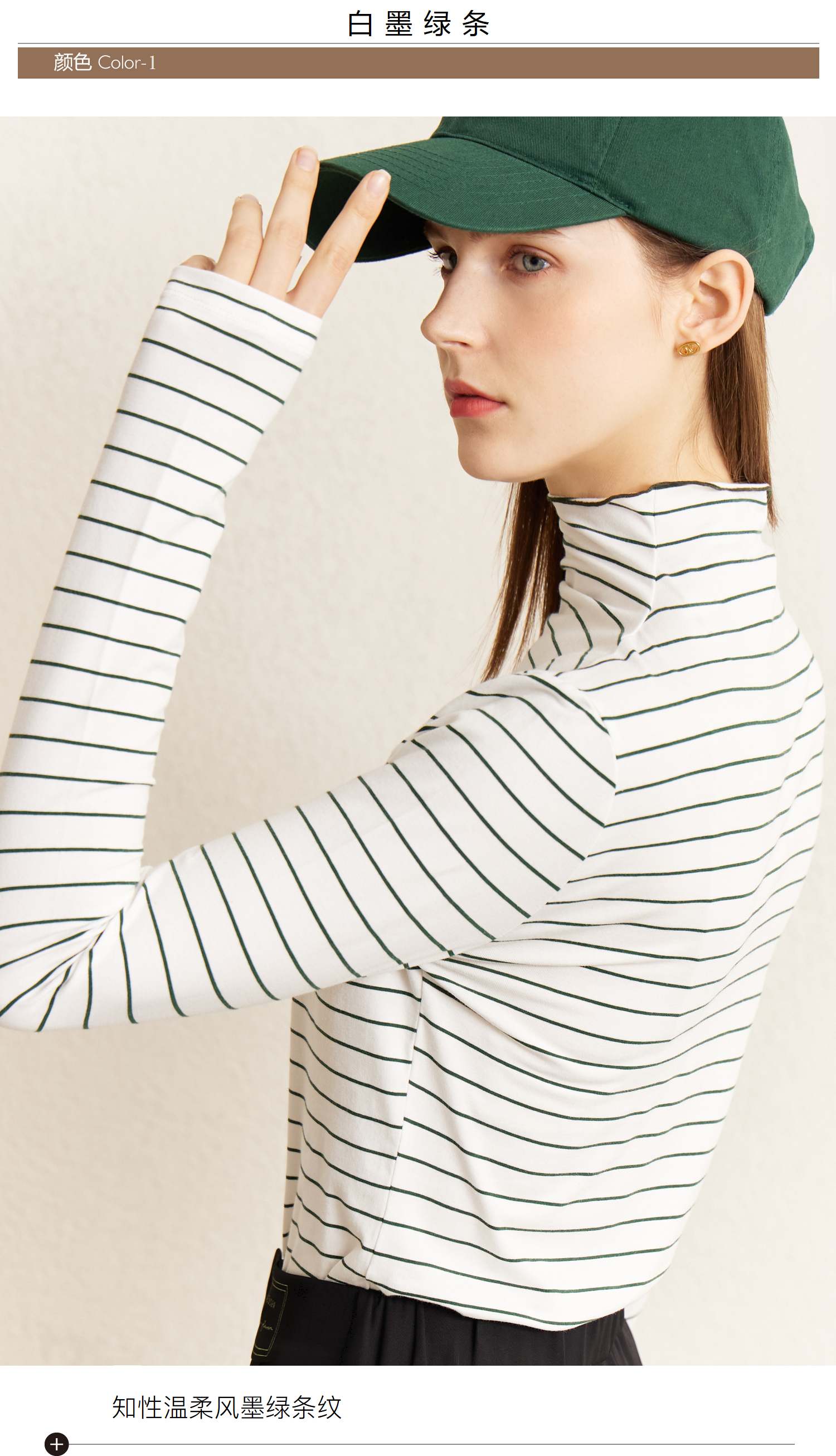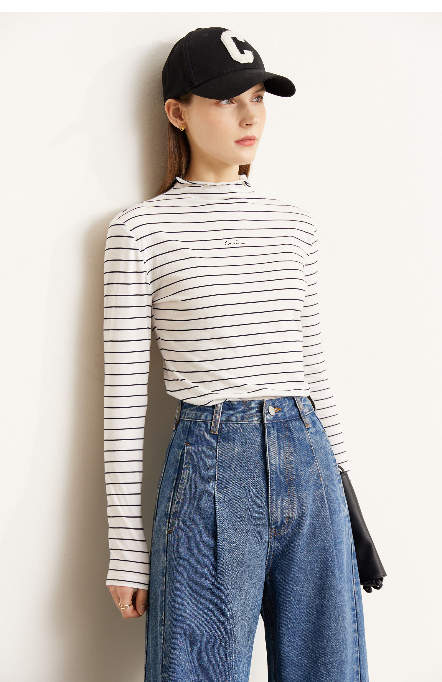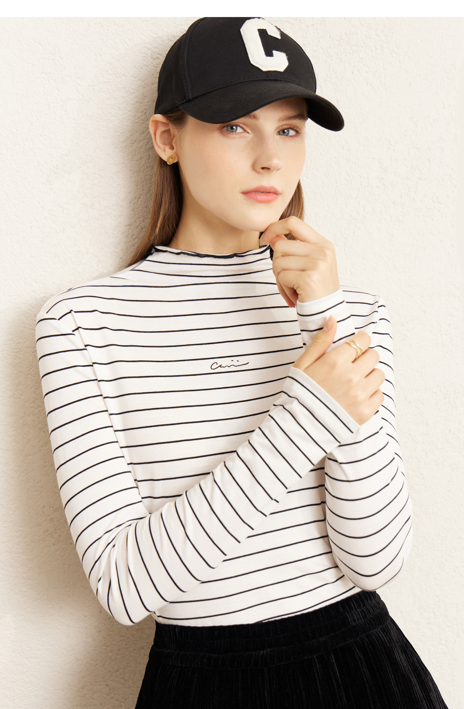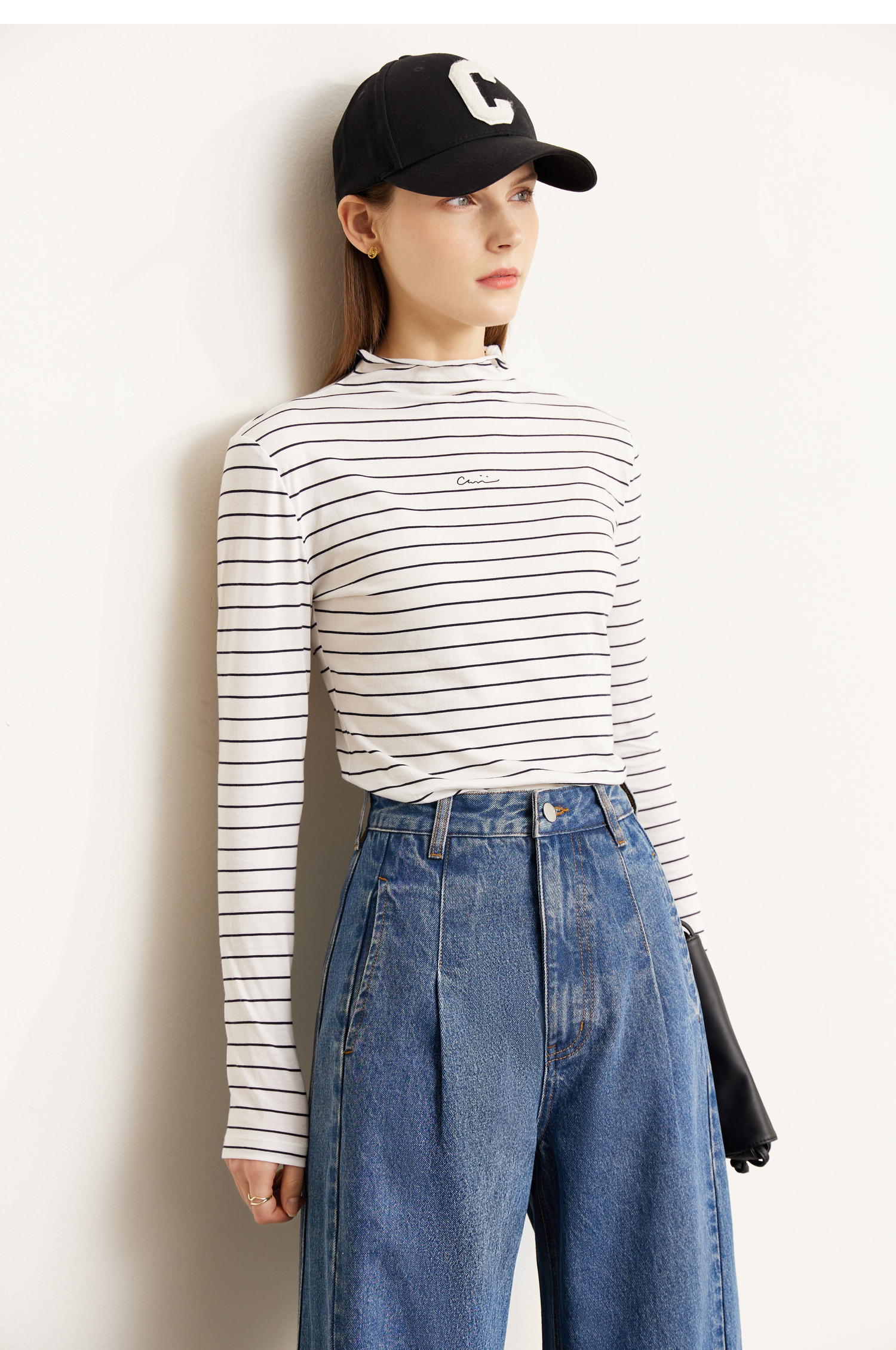 Amii2022秋裝新款修身百搭打底衫T恤半高領細條紋全棉間條上衣女