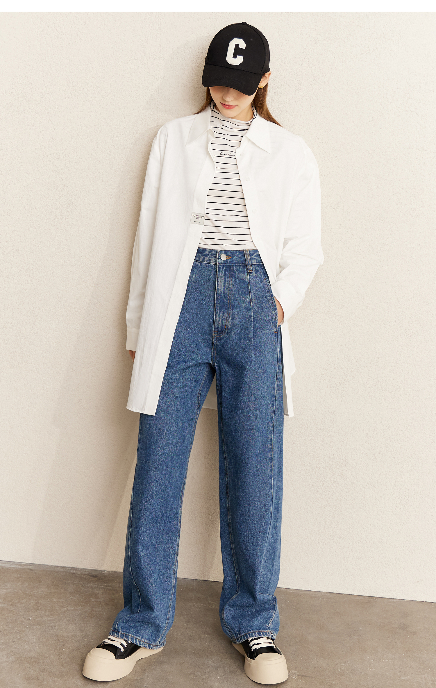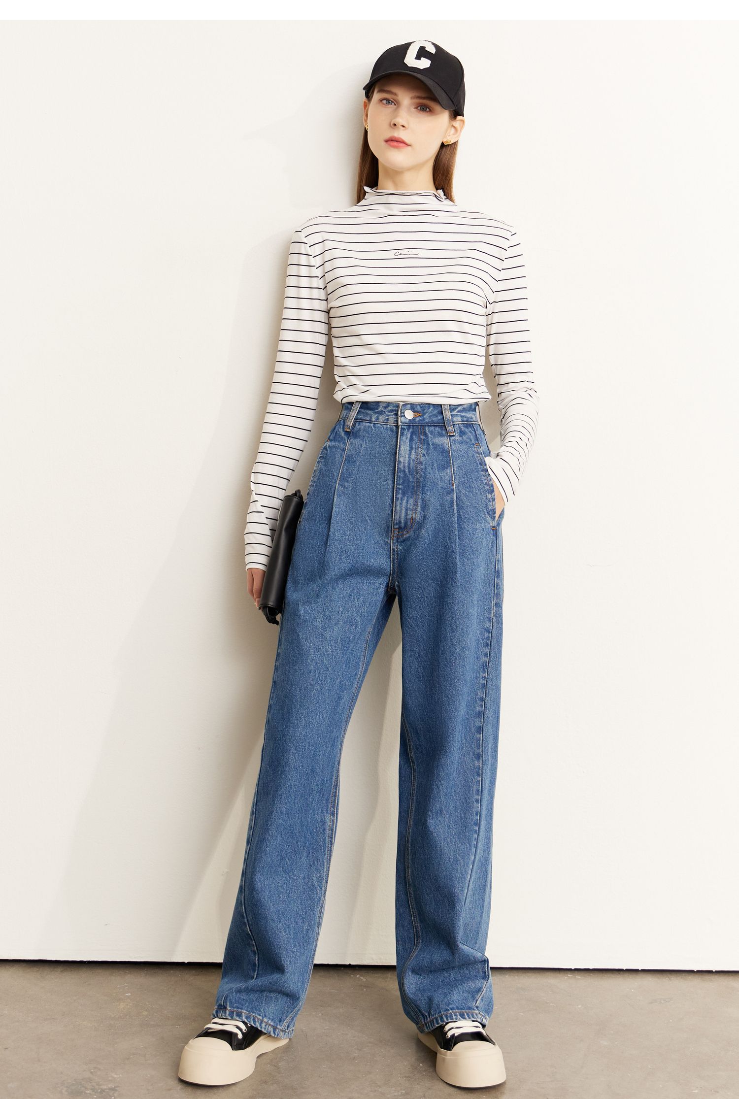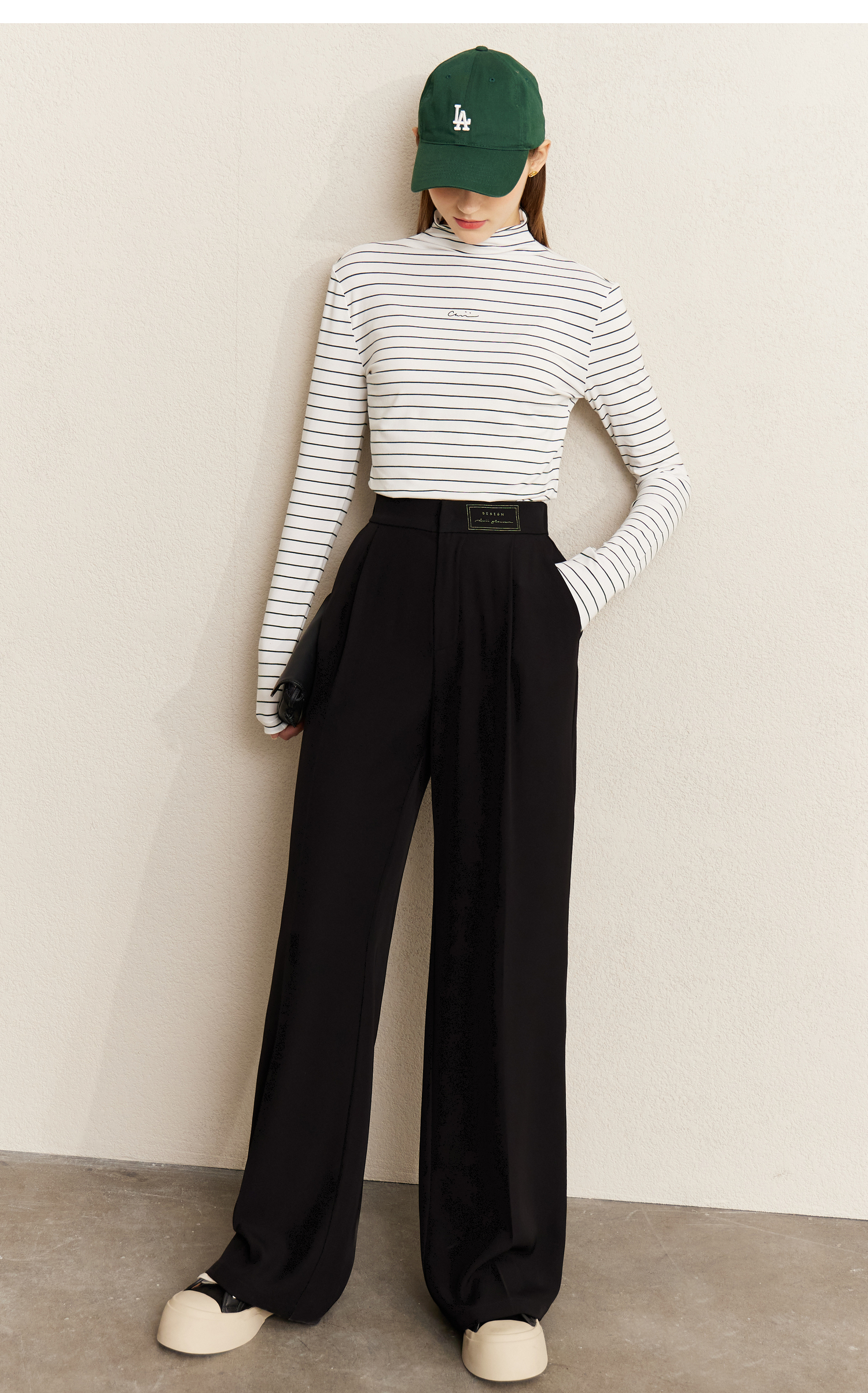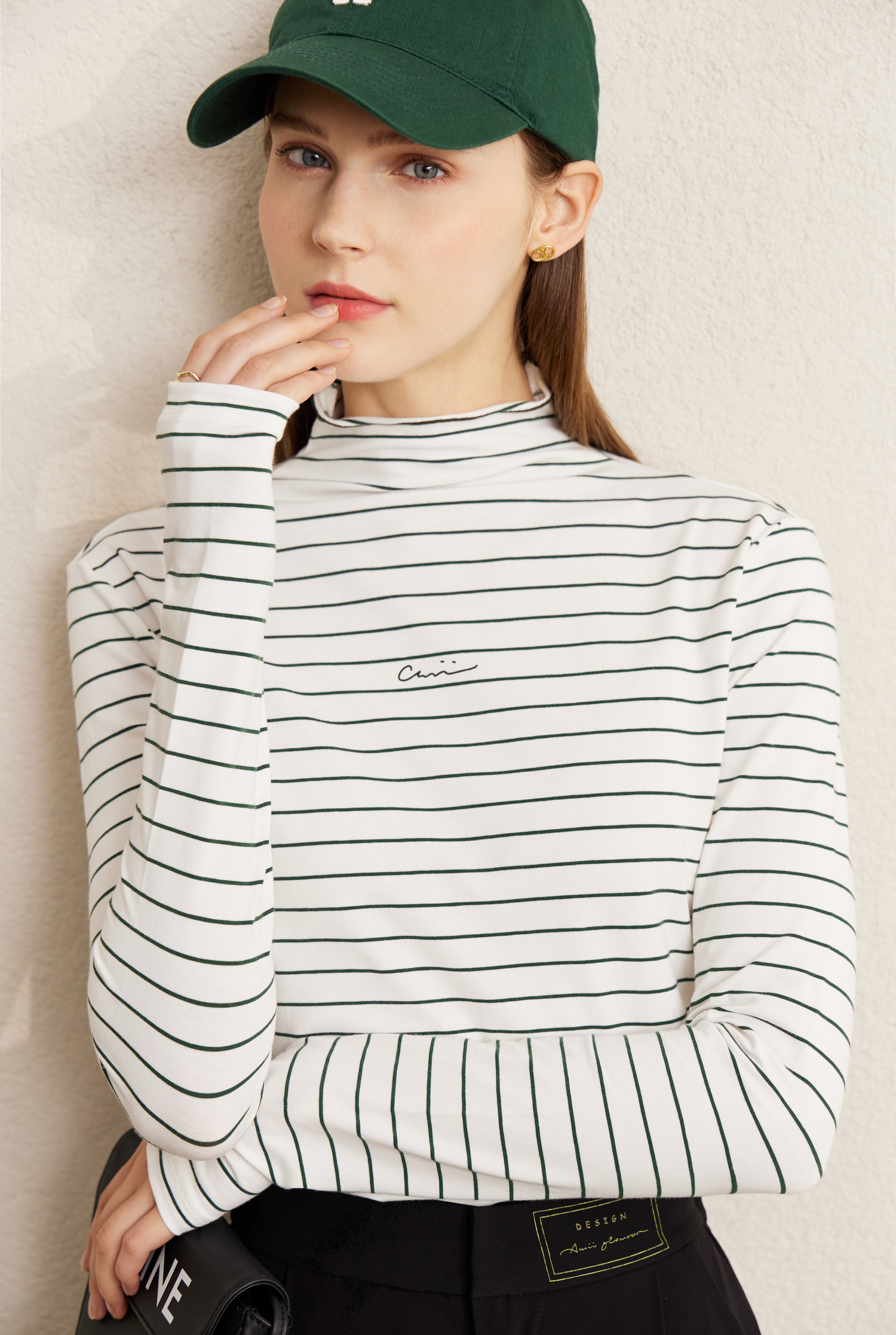 Amii2022秋裝新款修身百搭打底衫T恤半高領細條紋全棉間條上衣女
