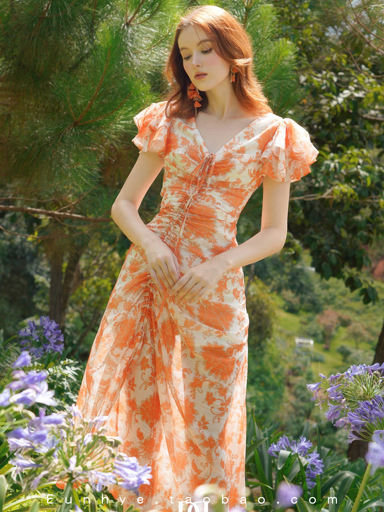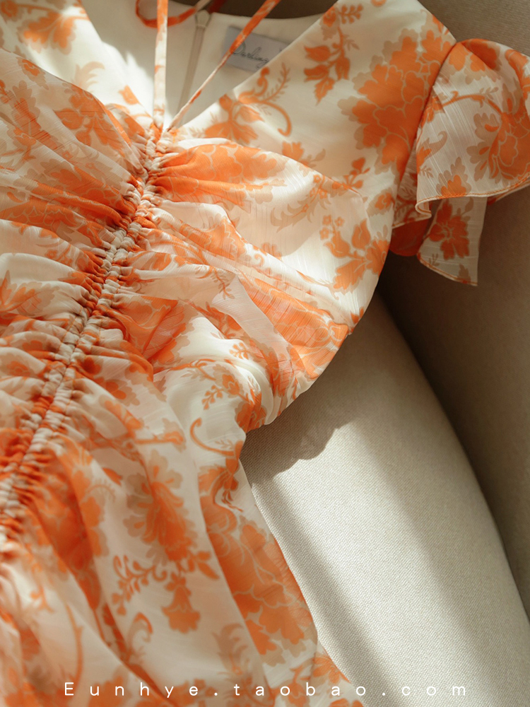 越南小眾DARLIN DIVA2022夏季新款荷葉邊碎花褶皺不規則顯瘦長裙