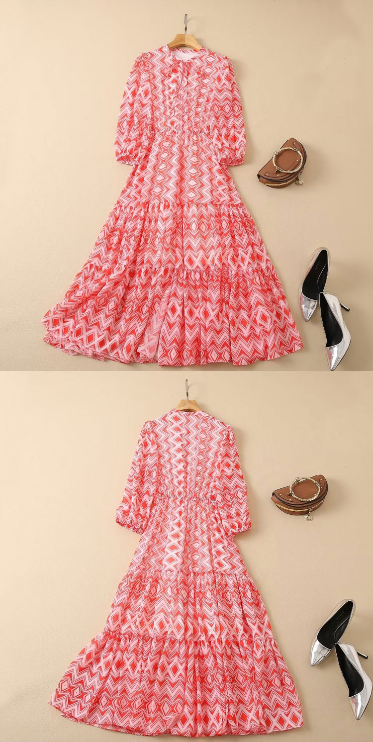 歐洲站2023年夏季新款高級感單排扣印花長裙翻領襯衫雪紡連衣裙女