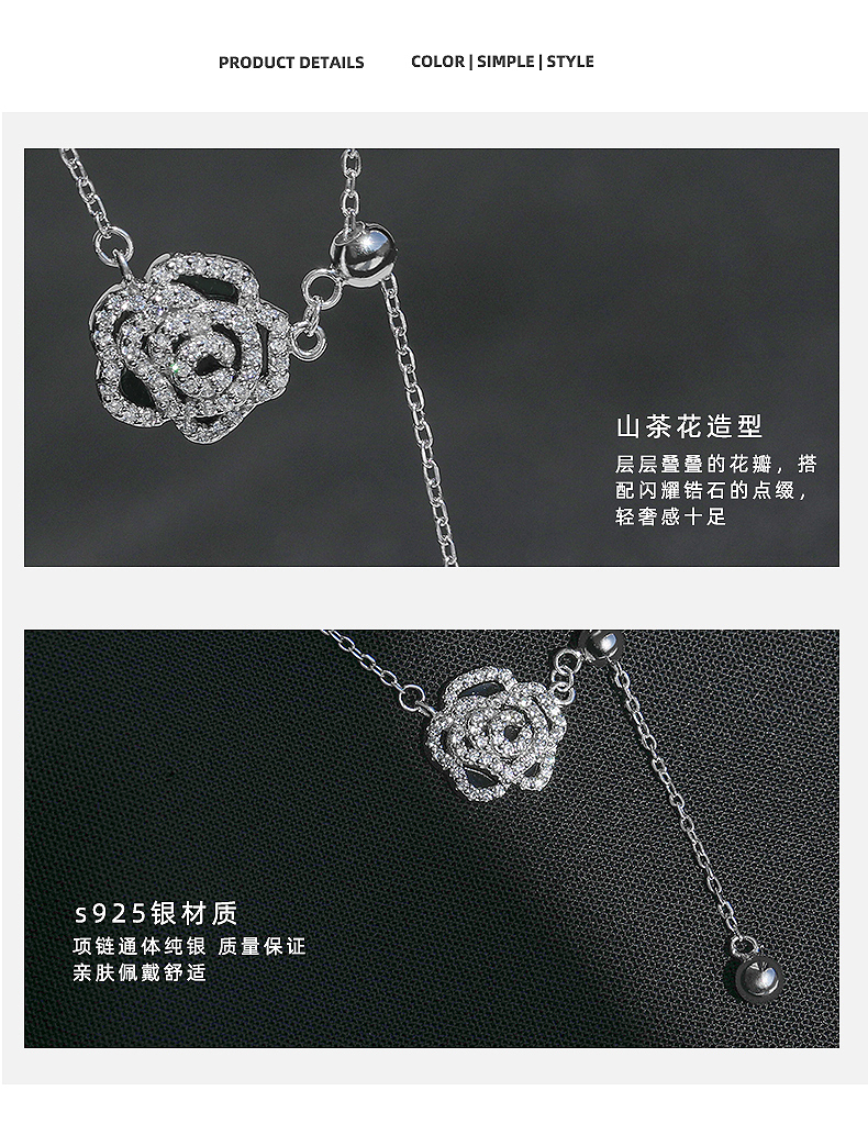 夏耘小香風S925純銀山茶花鋯石項鏈女輕奢小眾高級設計感鎖骨鏈