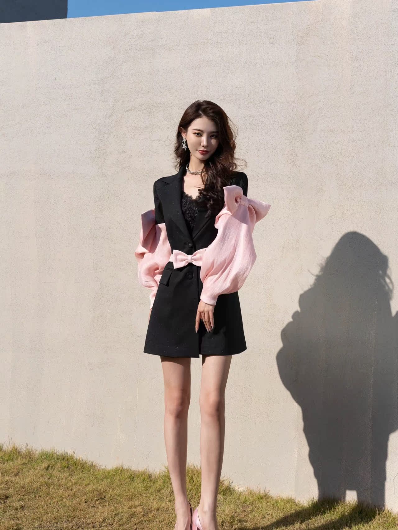 一線品牌折扣撿漏小眾高級定制七夕限定黑撞粉西裝連衣裙(配腰繩)