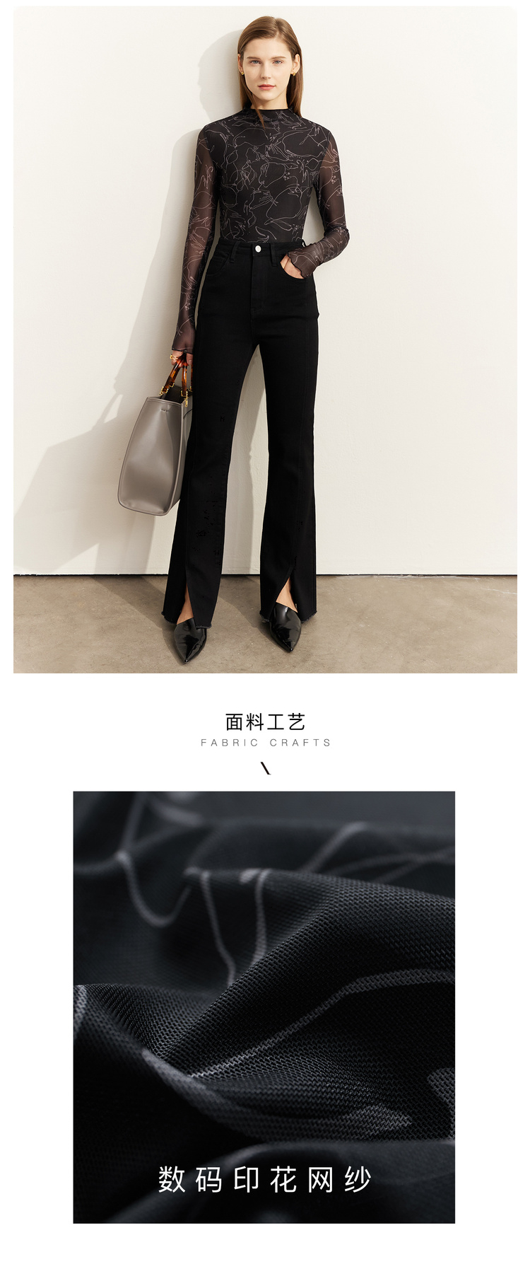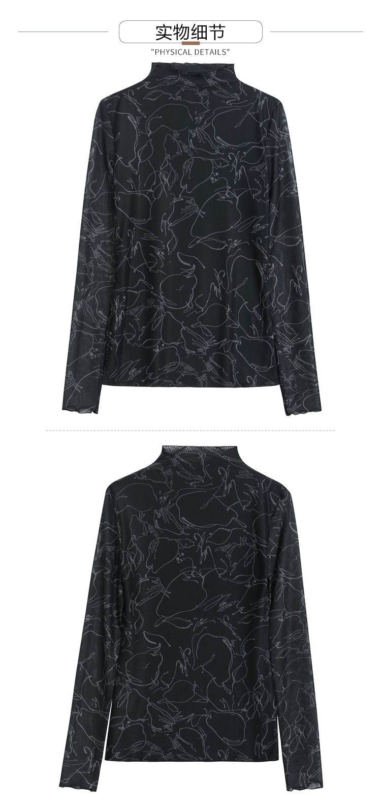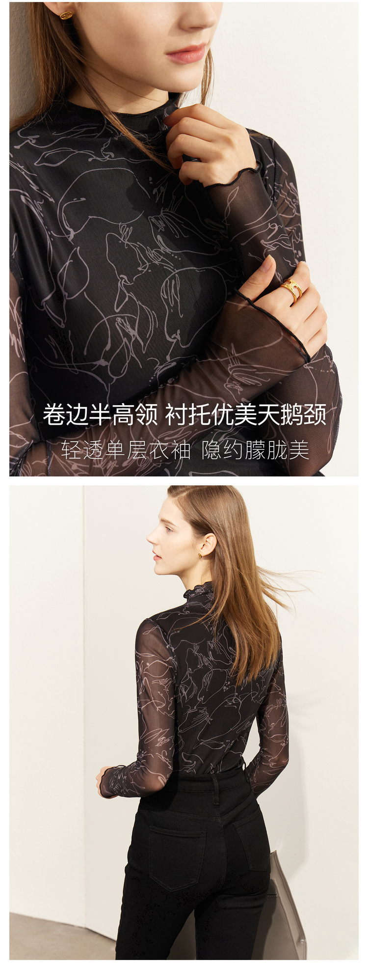 Amii2023年秋新款水果印花網紗設計感T恤小眾上衣長袖打底小衫女