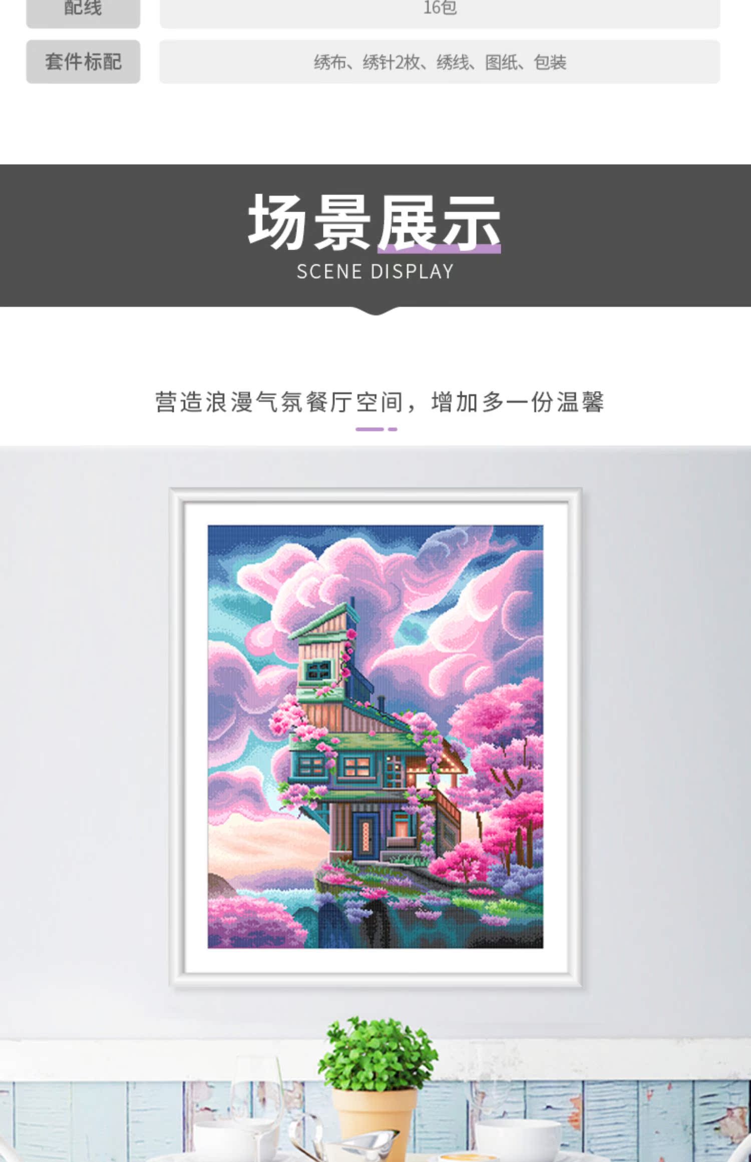 ks十字繡2023新款夢幻彩色云朵房子兒童房樓梯玄關豎版畫云端小屋