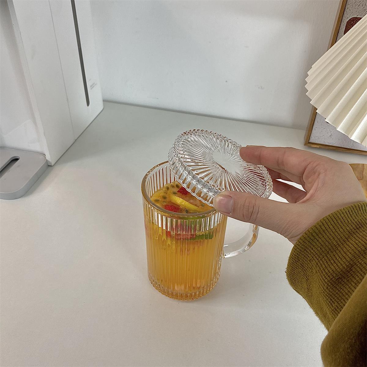 ins風豎條紋玻璃杯家用辦公室水杯飲料果茶杯帶蓋高顏值杯子