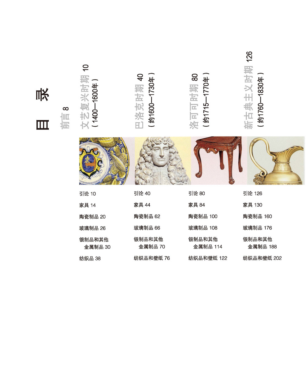 全書匯集了2300余幅精選的有代表性的插圖,包括照片、繪畫作品及手繪圖稿等,以圖解形式展示不同時期的裝飾元素,并通過翔實的文字介紹加以解釋。每一章節開始,宏觀闡述這一時期裝飾藝術的發展背景,并總結其主要的風格特點。然后分別對各裝飾元素進行獨立講解,并將這一時期不同國家和地區的此類裝飾元素進行對比,使內容表達直觀、系統。