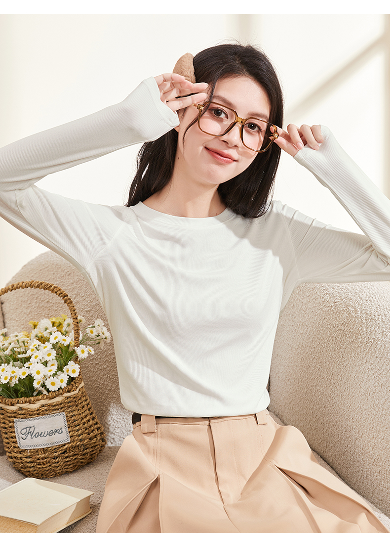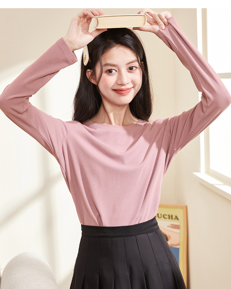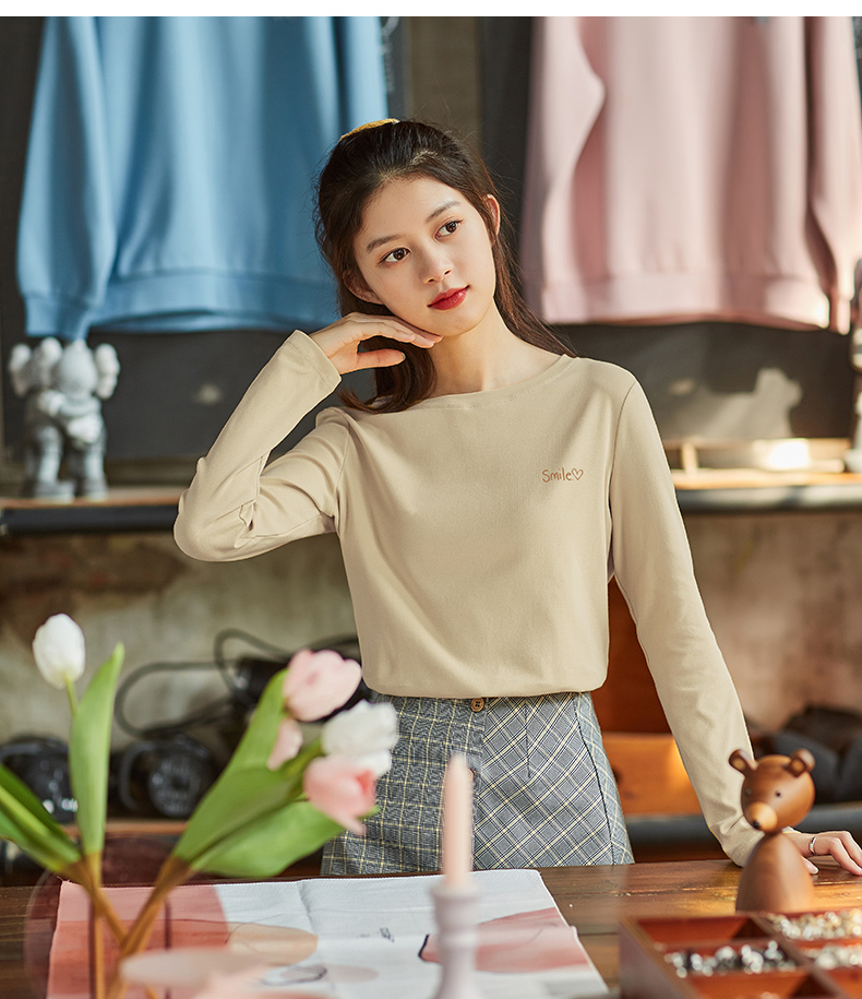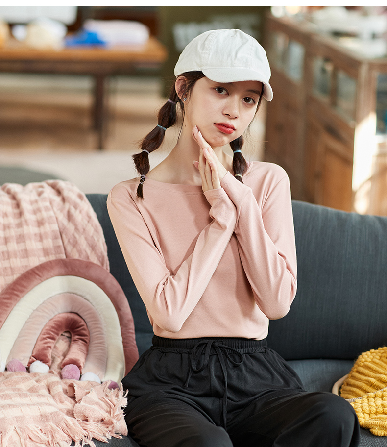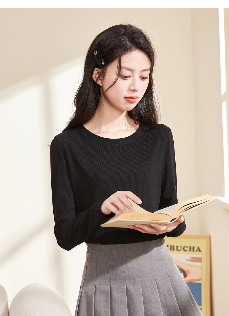 [商場同款]森馬長袖T恤女短款方領簡約秋2023新款緊身針織衫百搭