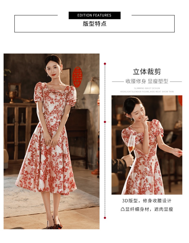 訂婚禮服女夏季敬酒服新娘2023新款小個子法式方領泡泡袖連衣裙