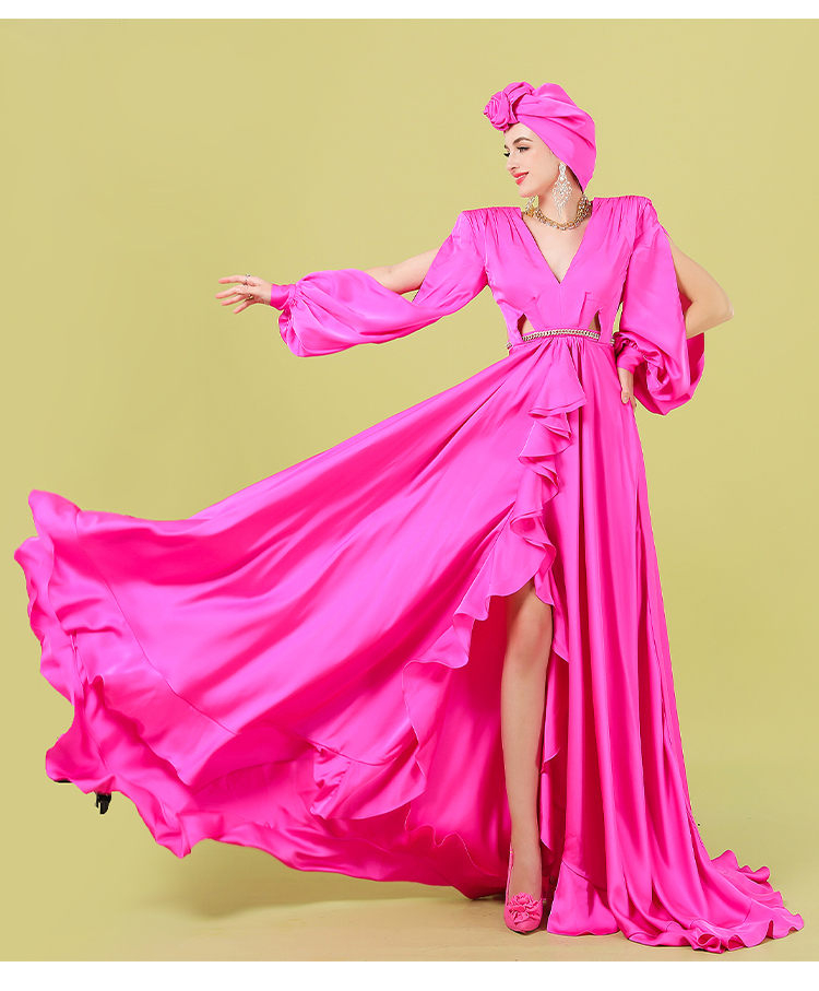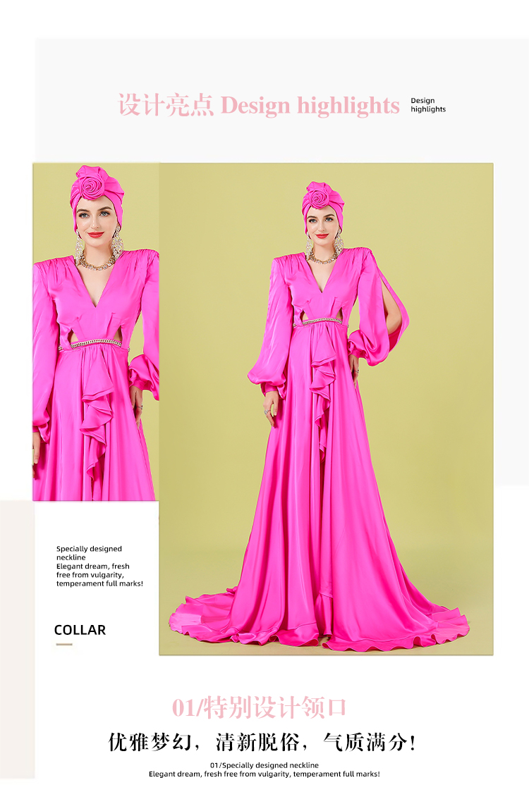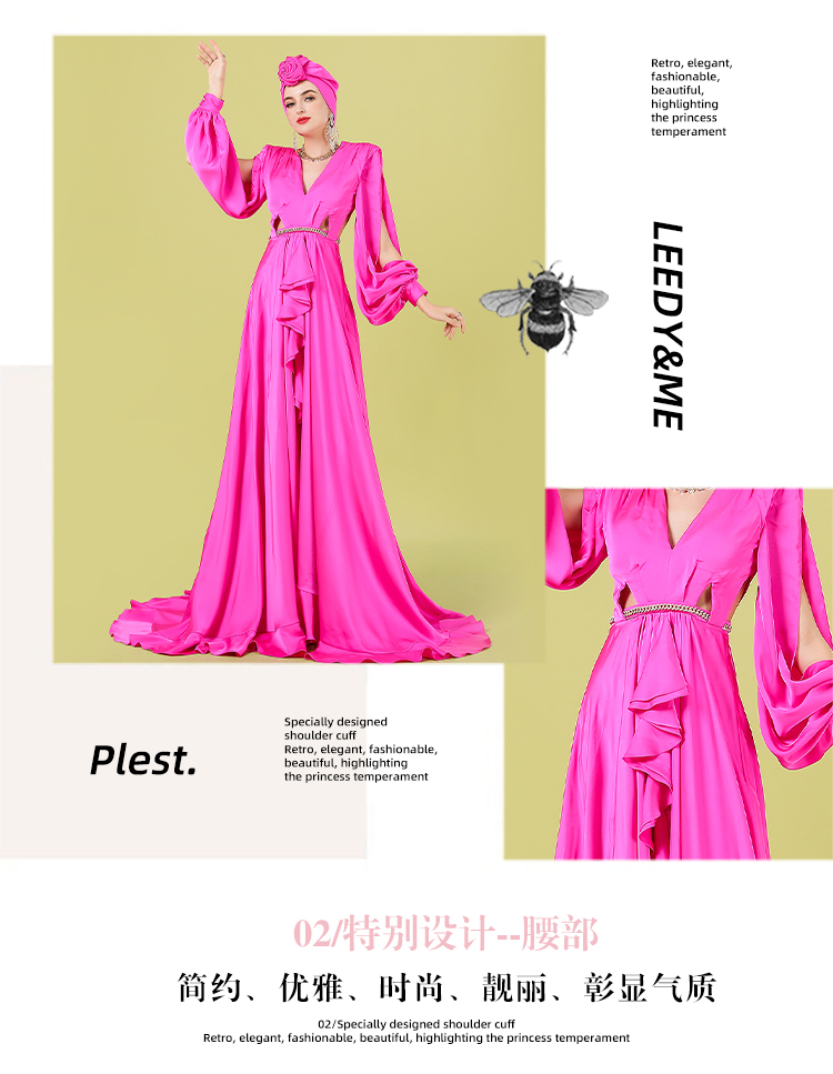 LEEDY&ME新春秋輕奢優雅性感玫紅色V領長裙開叉花邊長連衣裙女