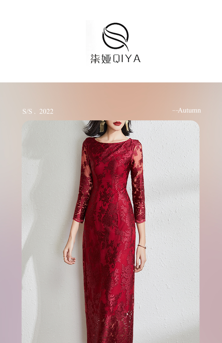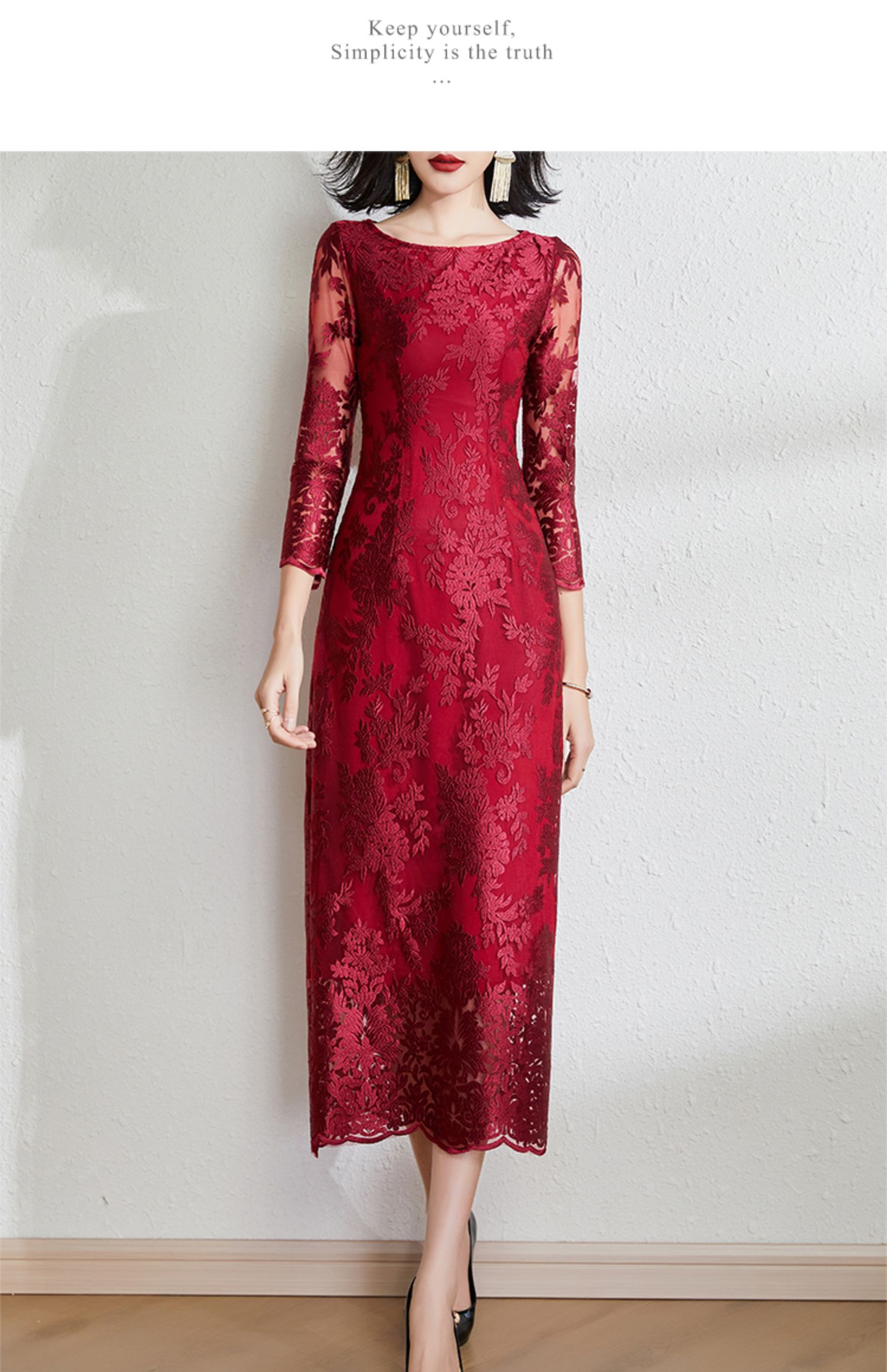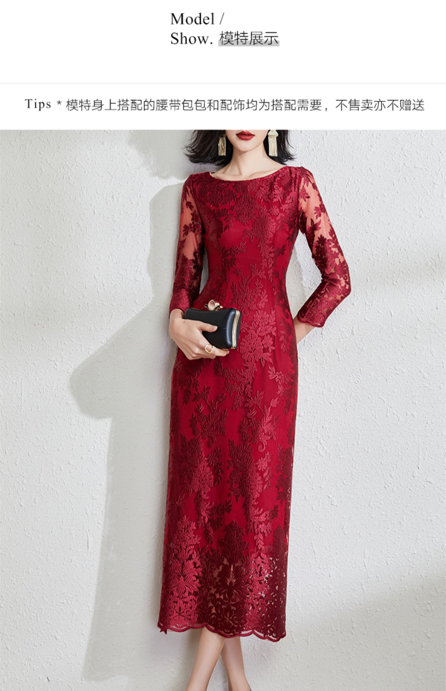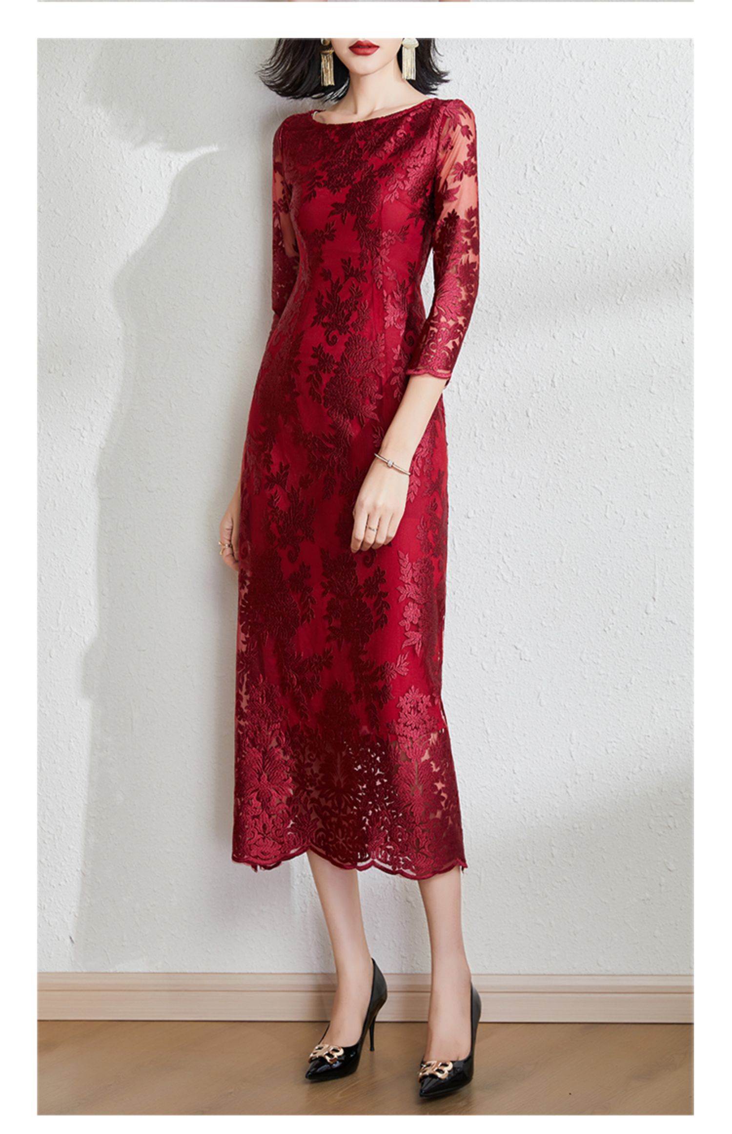 高端蕾絲繡花連衣裙女秋季2023年新款時尚收腰顯瘦中長款紅色裙子