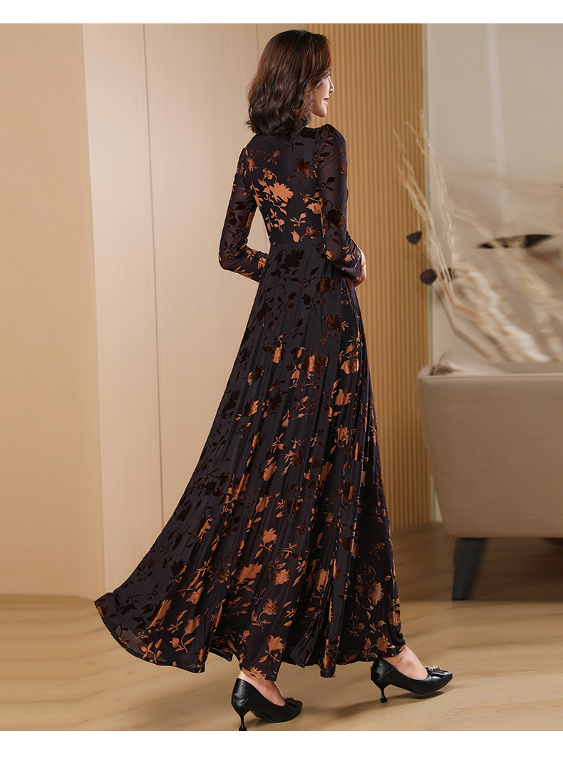 高級植絨提花咖色春秋連衣裙長袖2023新收腰名媛氣質減齡大擺長裙