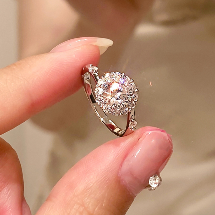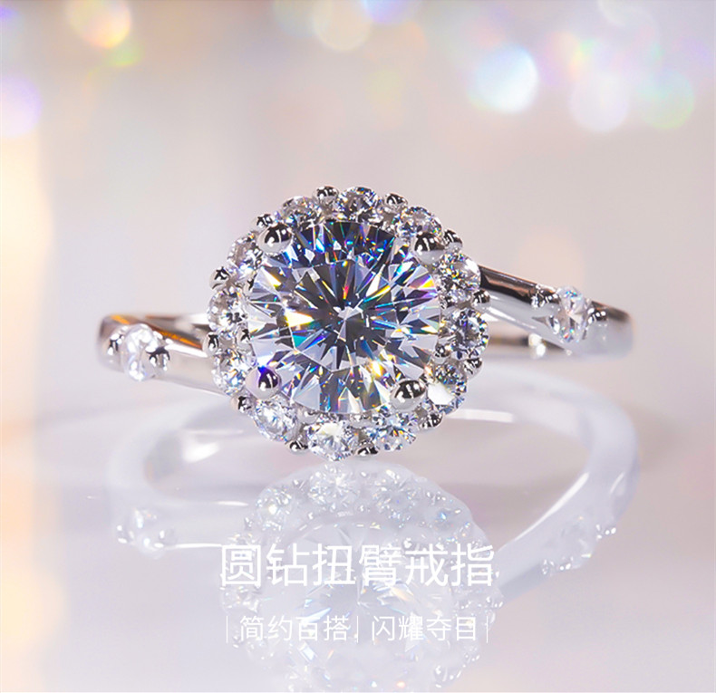 PT950鉑金進口D色莫桑石圓包扭臂戒指1克拉時尚奢華蛋糕鉆戒潮流