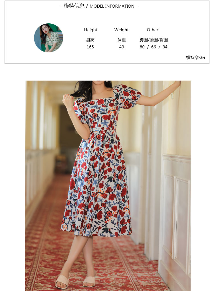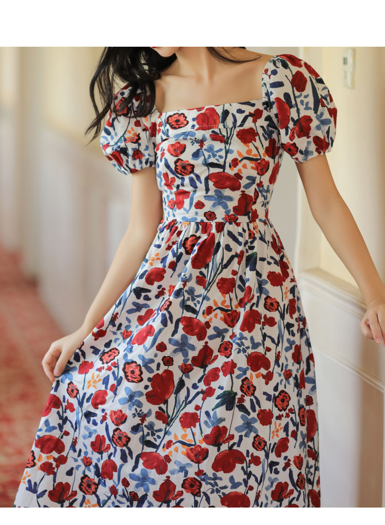 JUJU定制高級感印花裙子收腰顯瘦氣質方領法式碎花連衣裙夏季女