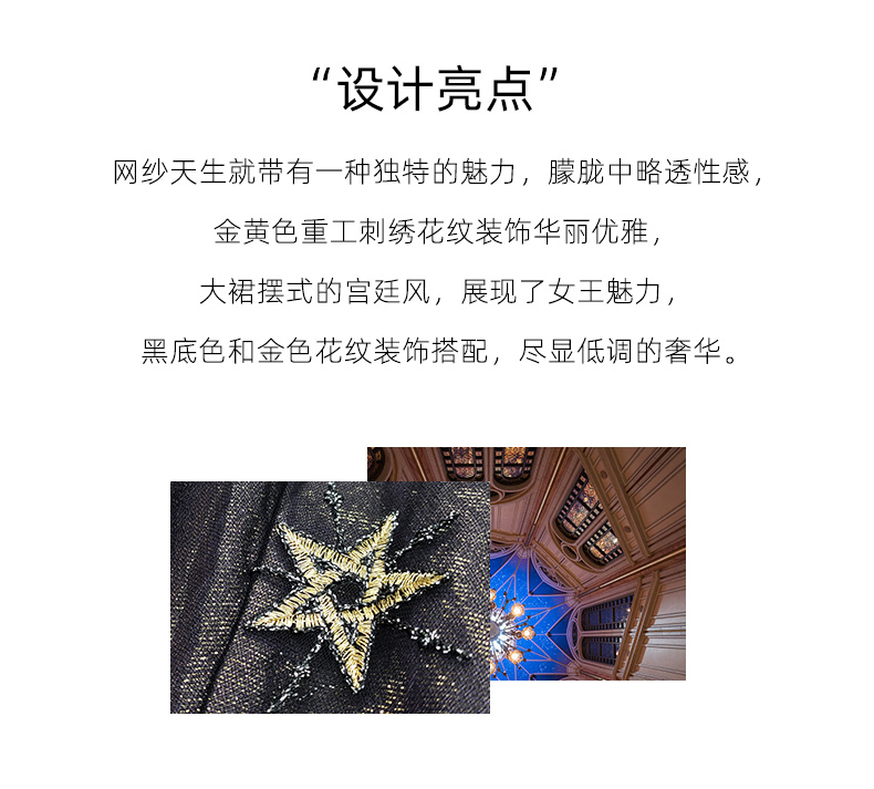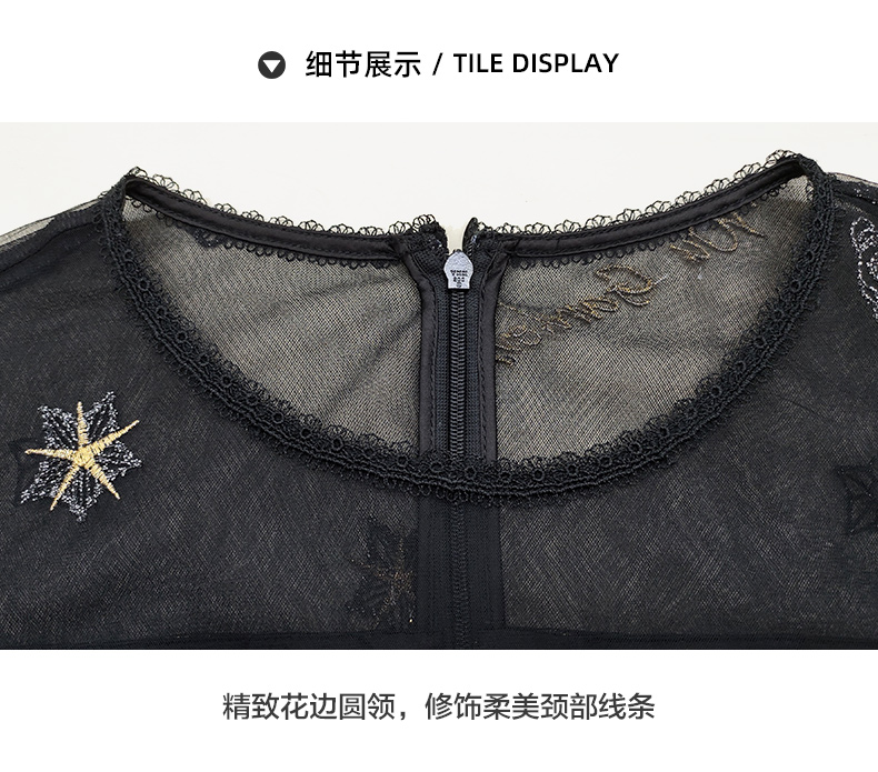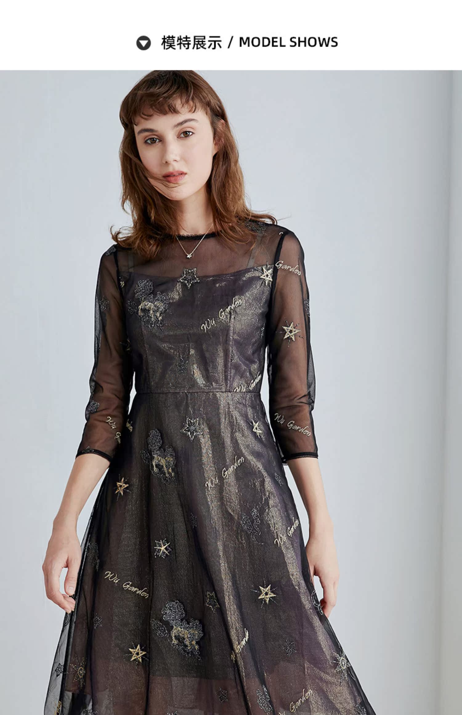 Ofiman2023秋新款氣質刺繡花網紗拼接修身花邊領連衣裙女
