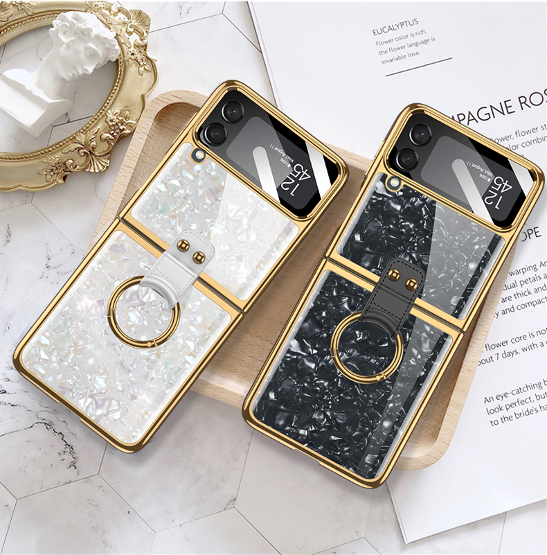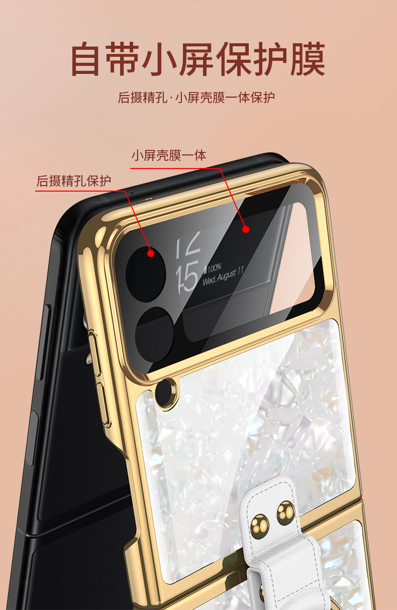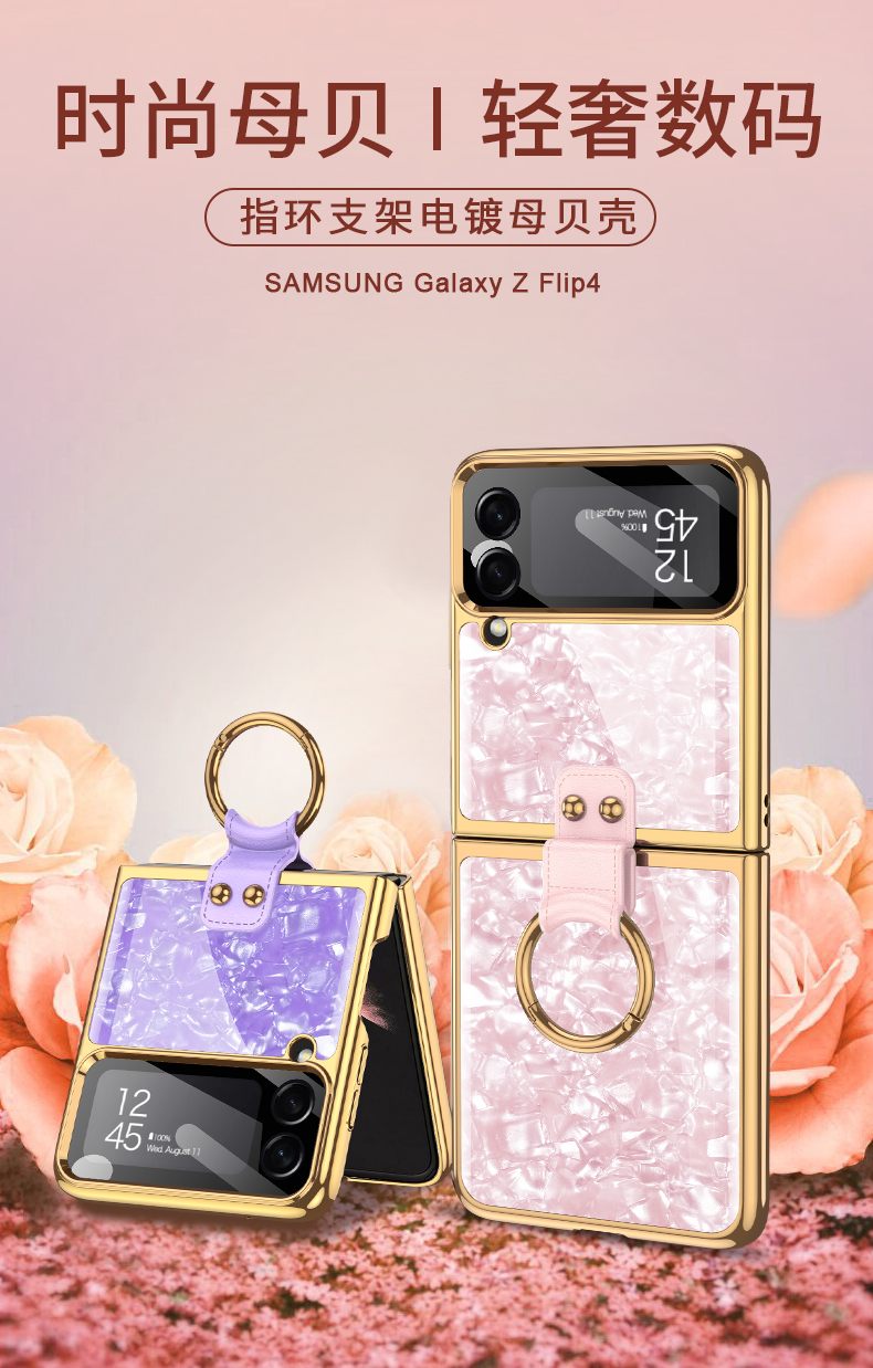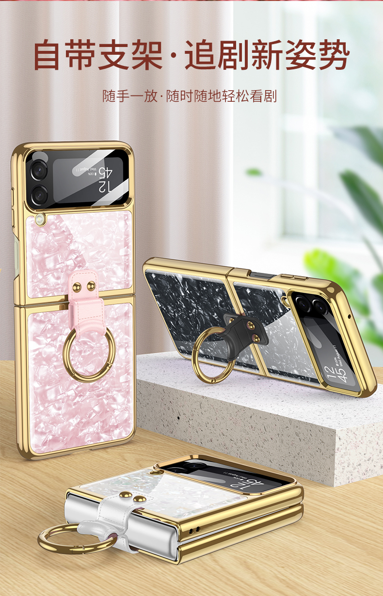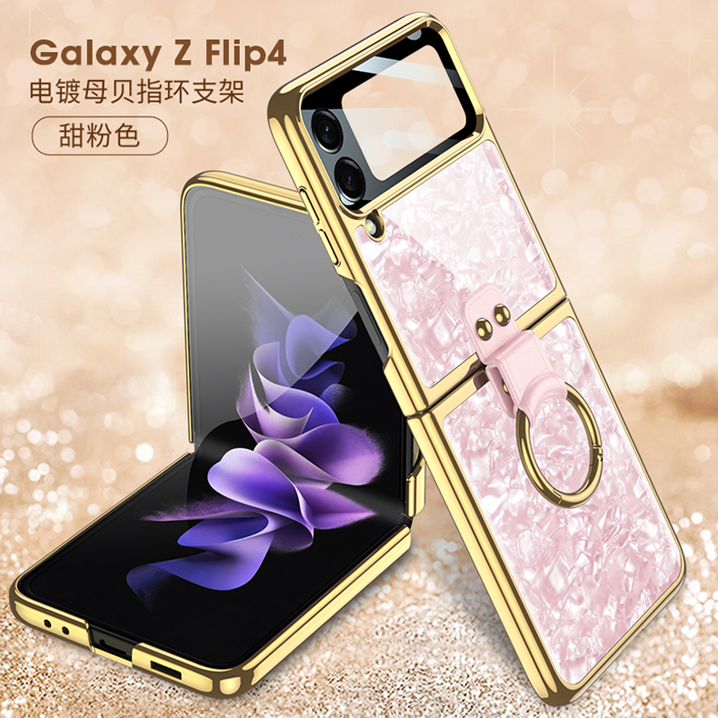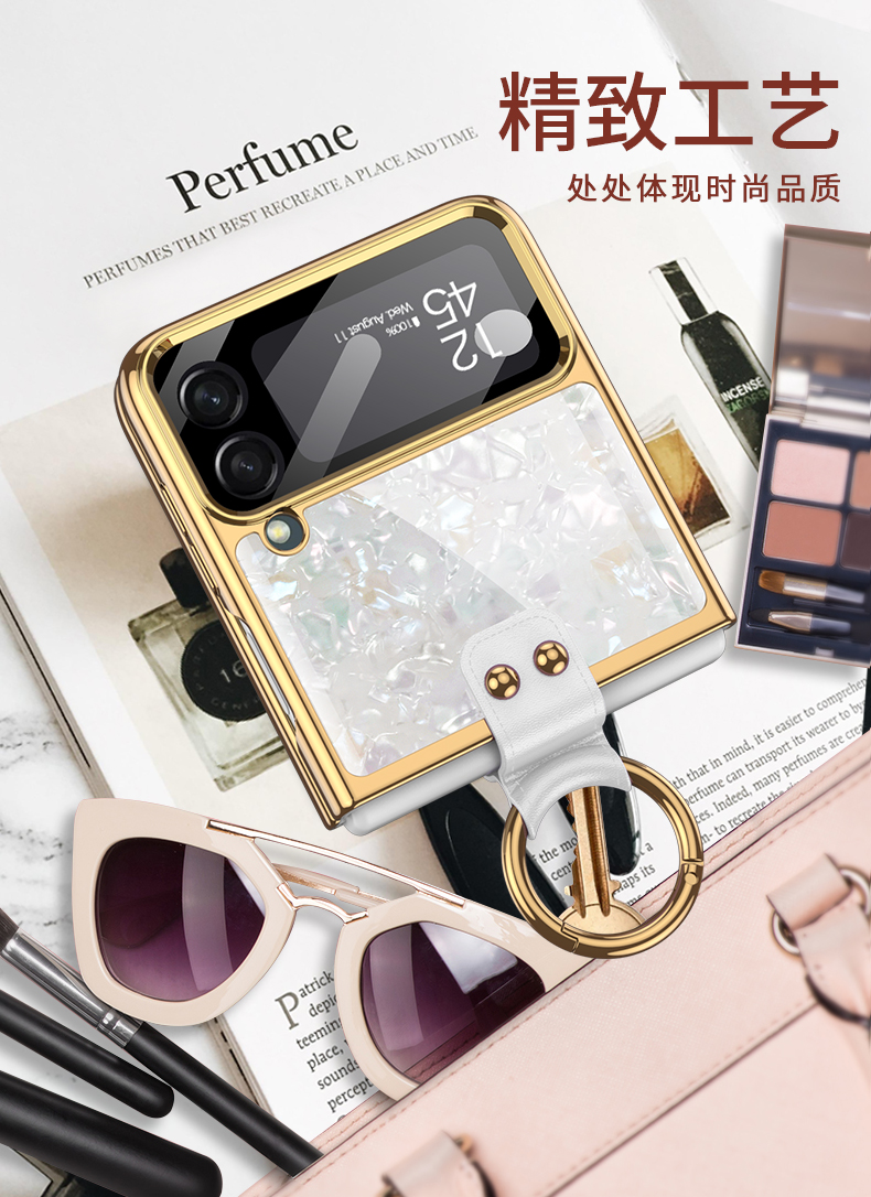夢幻少女適用三星zflip4手機殼新款折疊屏手提指環防摔w23 flip心系天下奢華珍珠貝母zflip3電鍍手拎指環7110