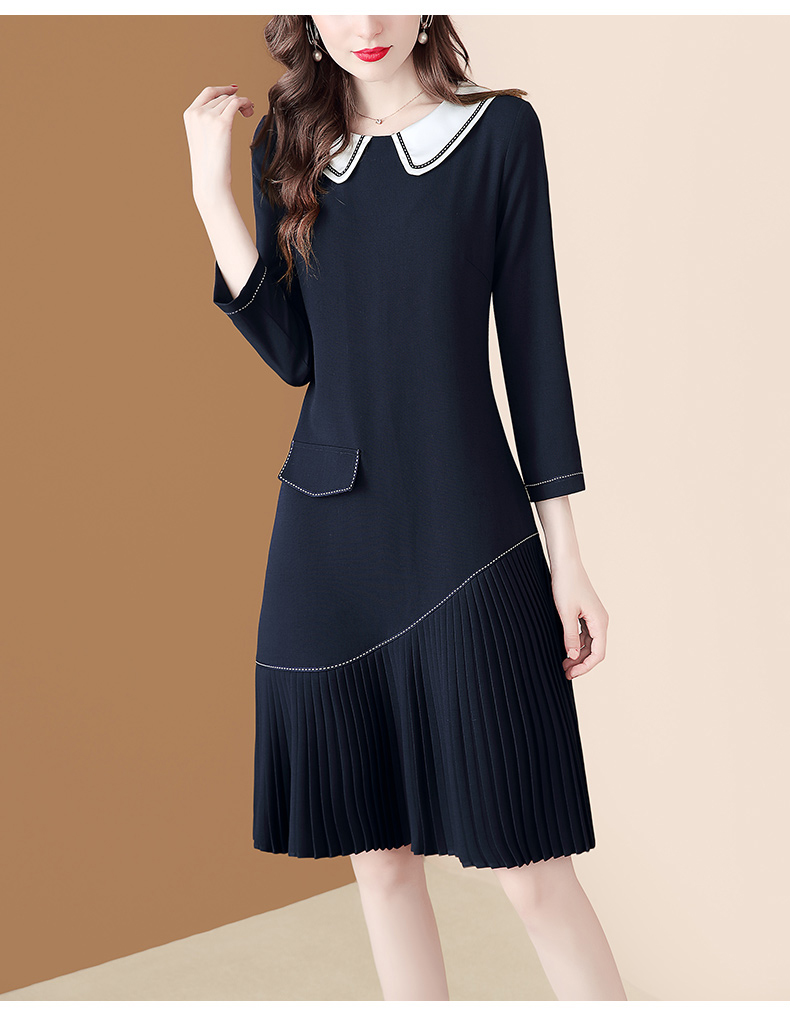 2023年春季新款連衣裙休閑黑色高貴優雅氣質女遮肚中袖春秋百褶裙