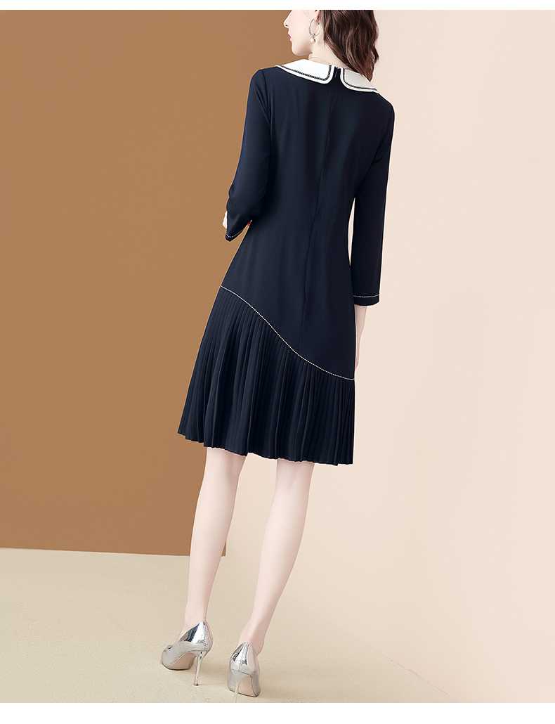 春秋季2023新款大碼女裝設計師款小眾長袖連衣裙娃娃領藏藍色顯高