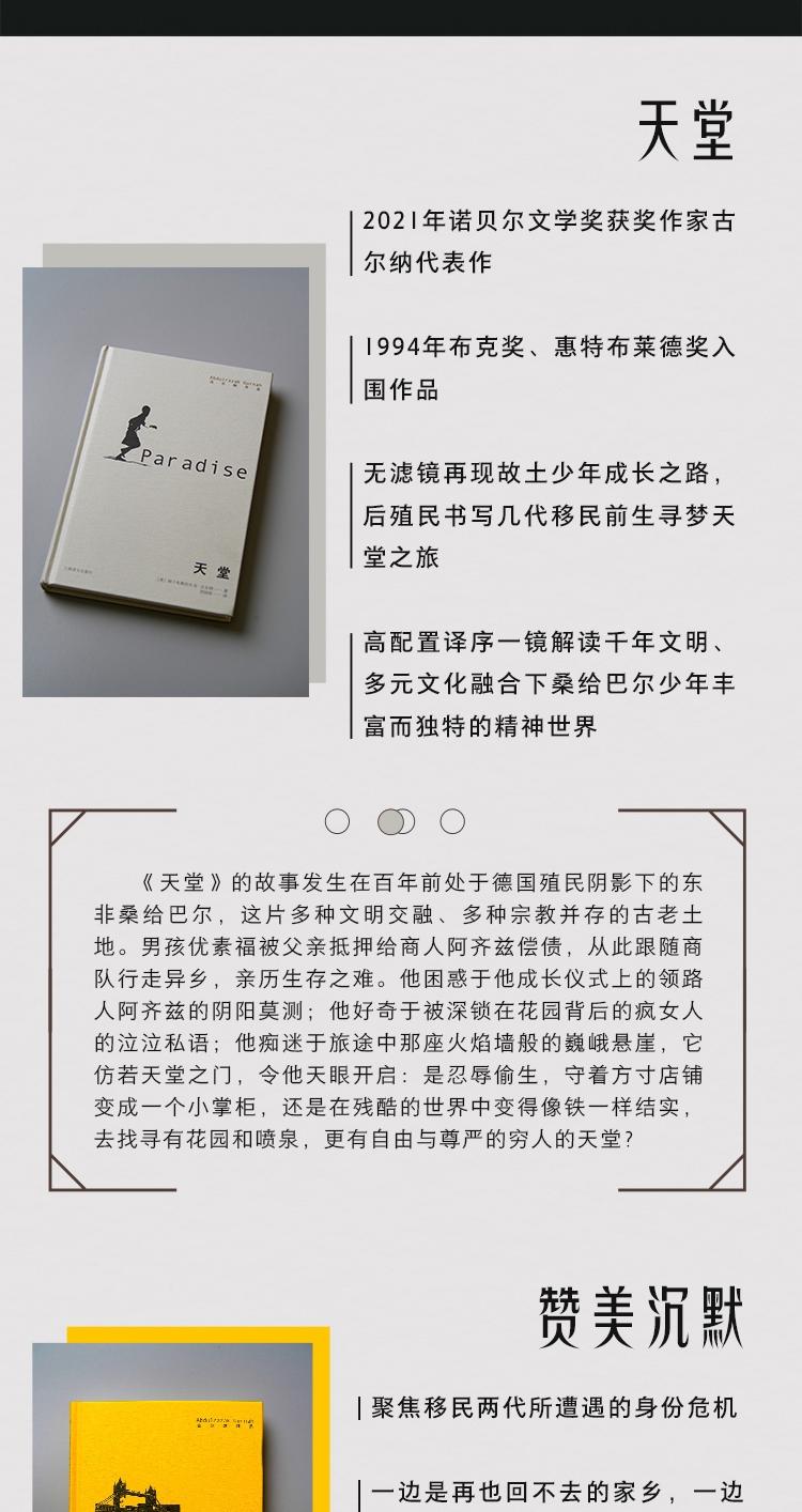 《海邊》講述了20世紀末從桑給巴爾來到英國尋求政治避難的中年人薩利赫?奧馬爾的遭遇。抵達英國后,奧馬爾被安排暫住在一個海邊小鎮,由于入境時使用了昔日家鄉仇敵賴哲卜?舍爾邦的名字,其子拉蒂夫找上門來。由此引出了兩家人的恩怨情仇。一同身處飽受敵視的異國他鄉,奧馬爾和拉蒂夫漸漸敞開心扉。真相終于浮出水面…… 《來世》的故事發生在一百多年前的非洲。還是個孩子的時候,伊利亞斯就在東非海岸上被德國殖民拐走。離家多年以后,伊利亞斯回到自己的村莊,得知父母早已去世,妹妹阿菲婭寄人籬下,說是收養,實則如奴隸般飽受虐待。哈姆扎同樣從戰場歸來,肉體、精神都已傷痕累累,幾乎一無所有——直到他遇見了美麗而勇敢的阿菲婭。隨著這幾個年輕人生活、工作和戀愛,他們的命運緊緊聯系在了一起,而就在此時,戰爭的陰影又一次迫近,歷經艱險才得以重聚的親人又一次面臨分離。 《天堂》的故事發生在百年前處于德國殖民陰影下的東非桑給巴爾,這片多種文明交融、多種宗教并存的古老土地。男孩優素福被父親抵押給商人阿齊茲償債,從此跟隨商隊行走異鄉,親歷生存之難。他困惑于他成長儀式上的領路人阿齊茲的陰陽莫測;他好奇于被深鎖在花園背后的瘋女人的泣泣私語;他癡迷于旅途中那座火焰墻般的巍峨懸崖,它仿若天堂之門,令他天眼開啟:是忍辱偷生,守著方寸店鋪變成一個小掌柜,還是在殘酷的世界中變得像鐵一樣結實,去找尋有花園和噴泉,更有自由與尊嚴的窮人的天堂? 《贊美沉默》:我感到胸口有硬塊,醫生告訴我可能是心臟病,而我的確有心病。