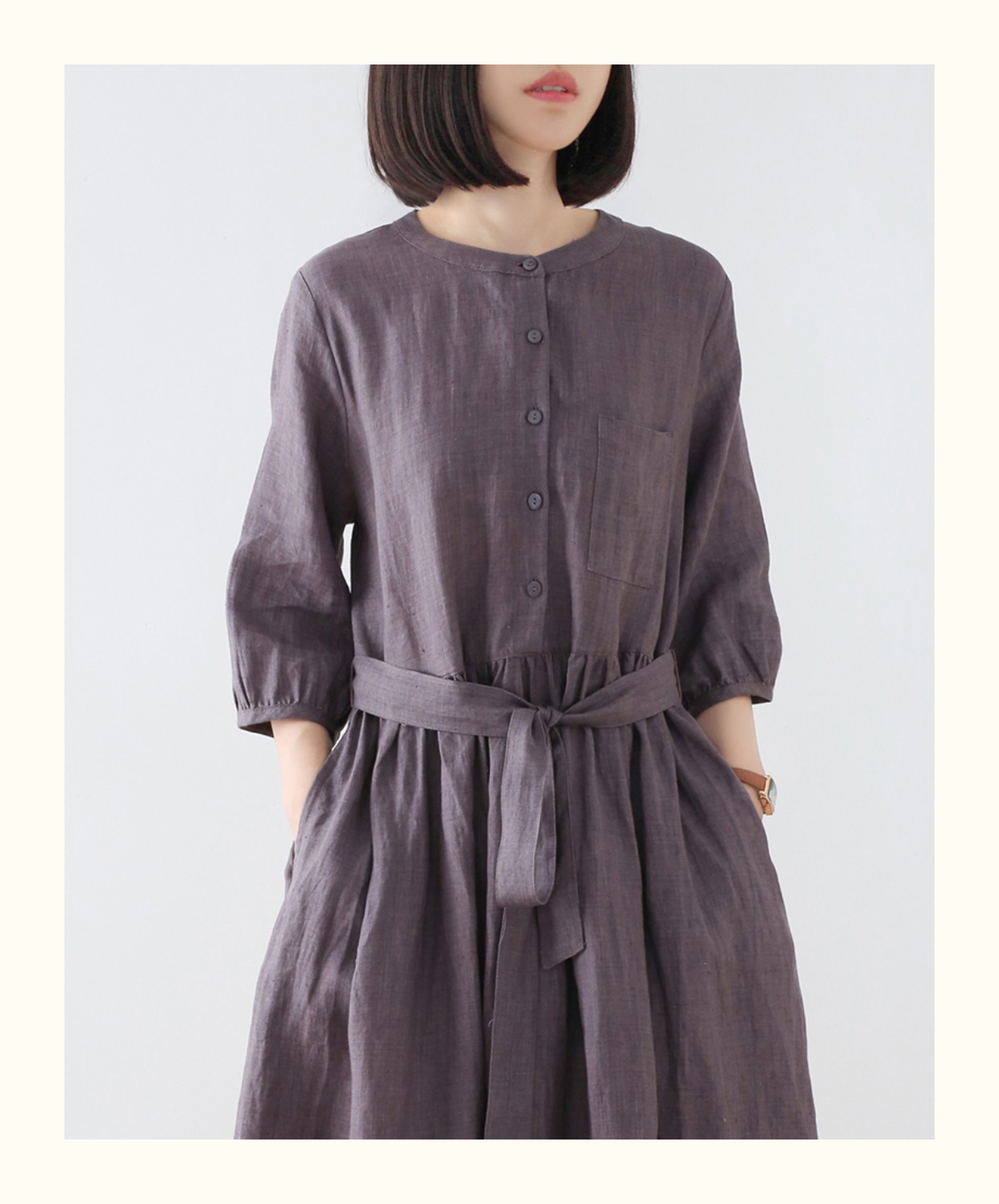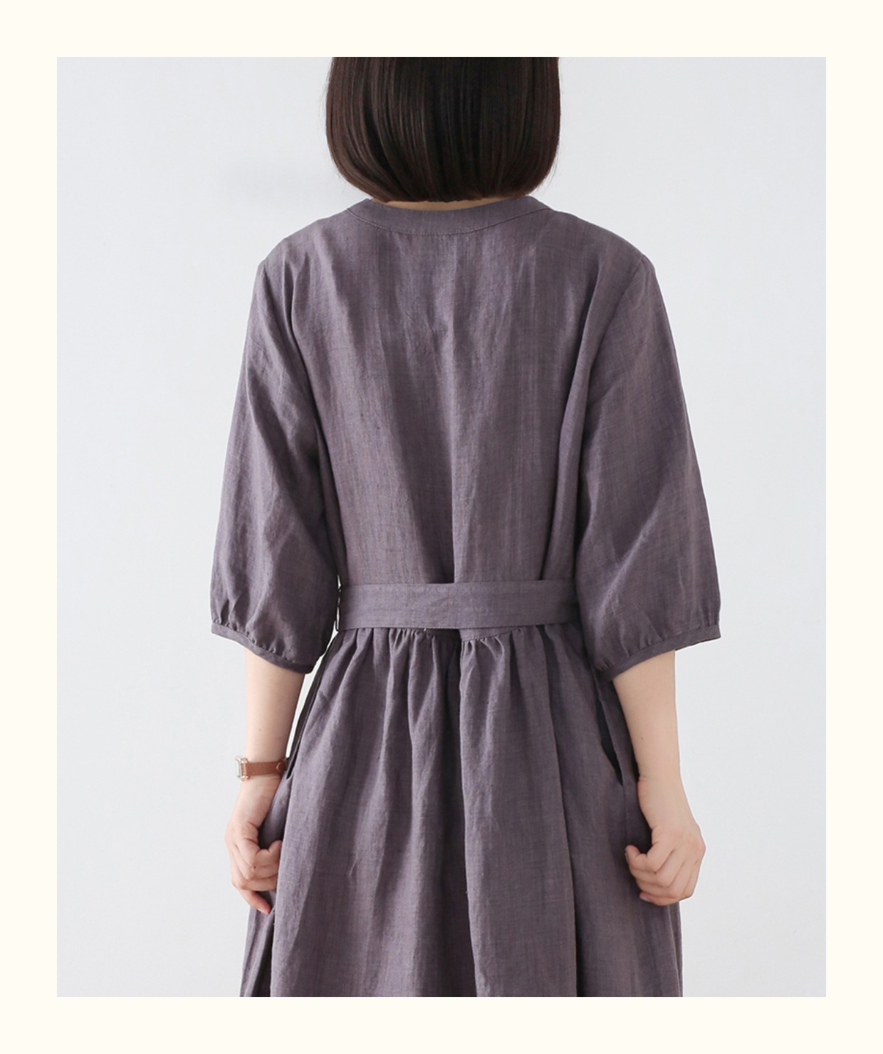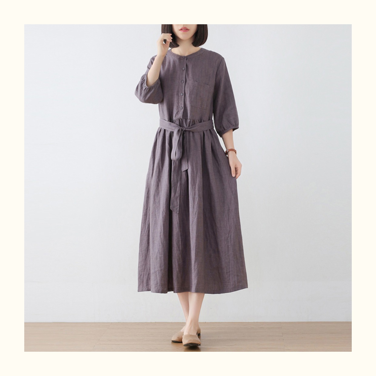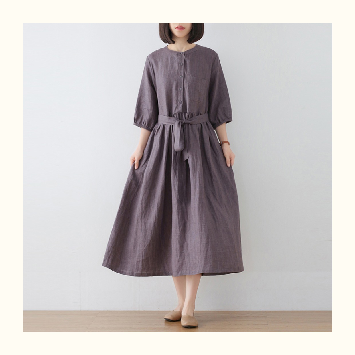 圓領高端色織亞麻煙紫色中袖秋季中長款休閑文藝舒適百搭連衣裙