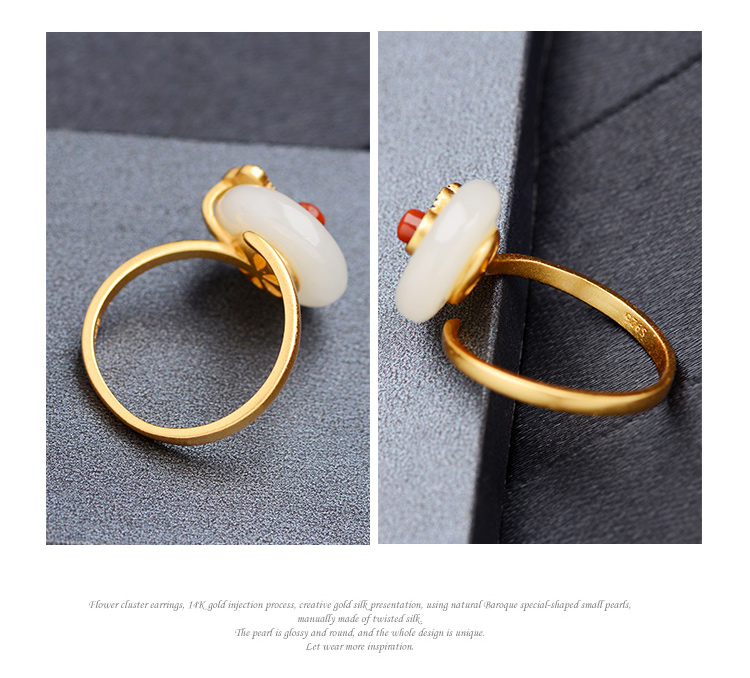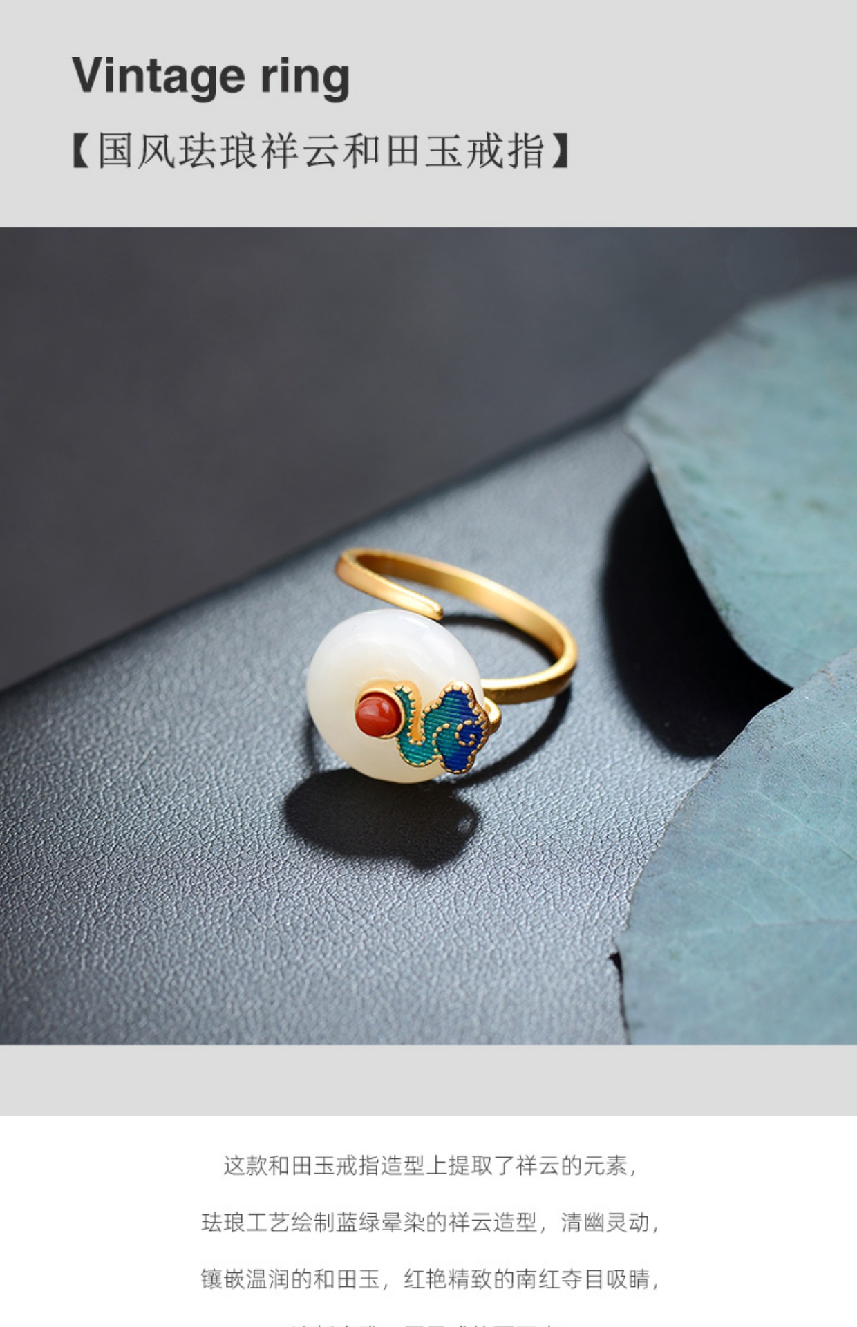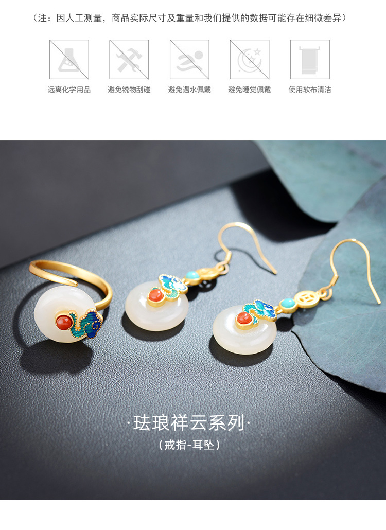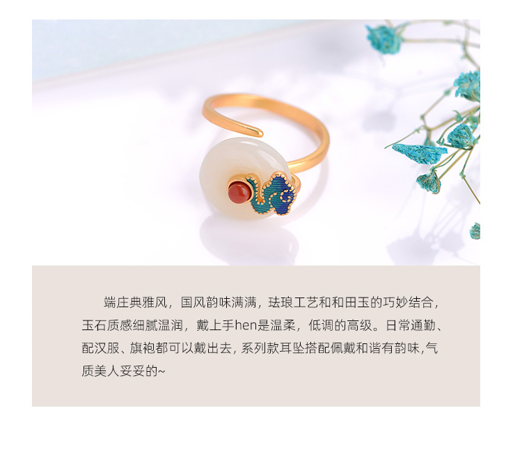 和田玉平安扣戒指祥云琺瑯開口可調節指環配漢服旗袍純銀手飾耳墜