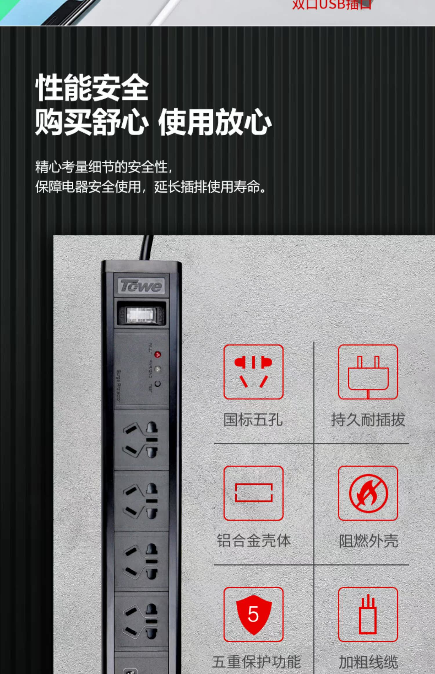 TOWE 同為65W智能快充插座插線板插排接線板Type-c口+USB+10A插孔
