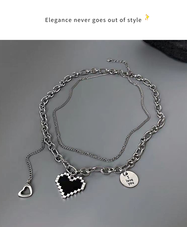 鈦鋼馬賽克愛心項鏈女高級設計感小眾像素桃心雙層鎖骨鏈吊墜配飾