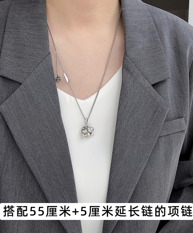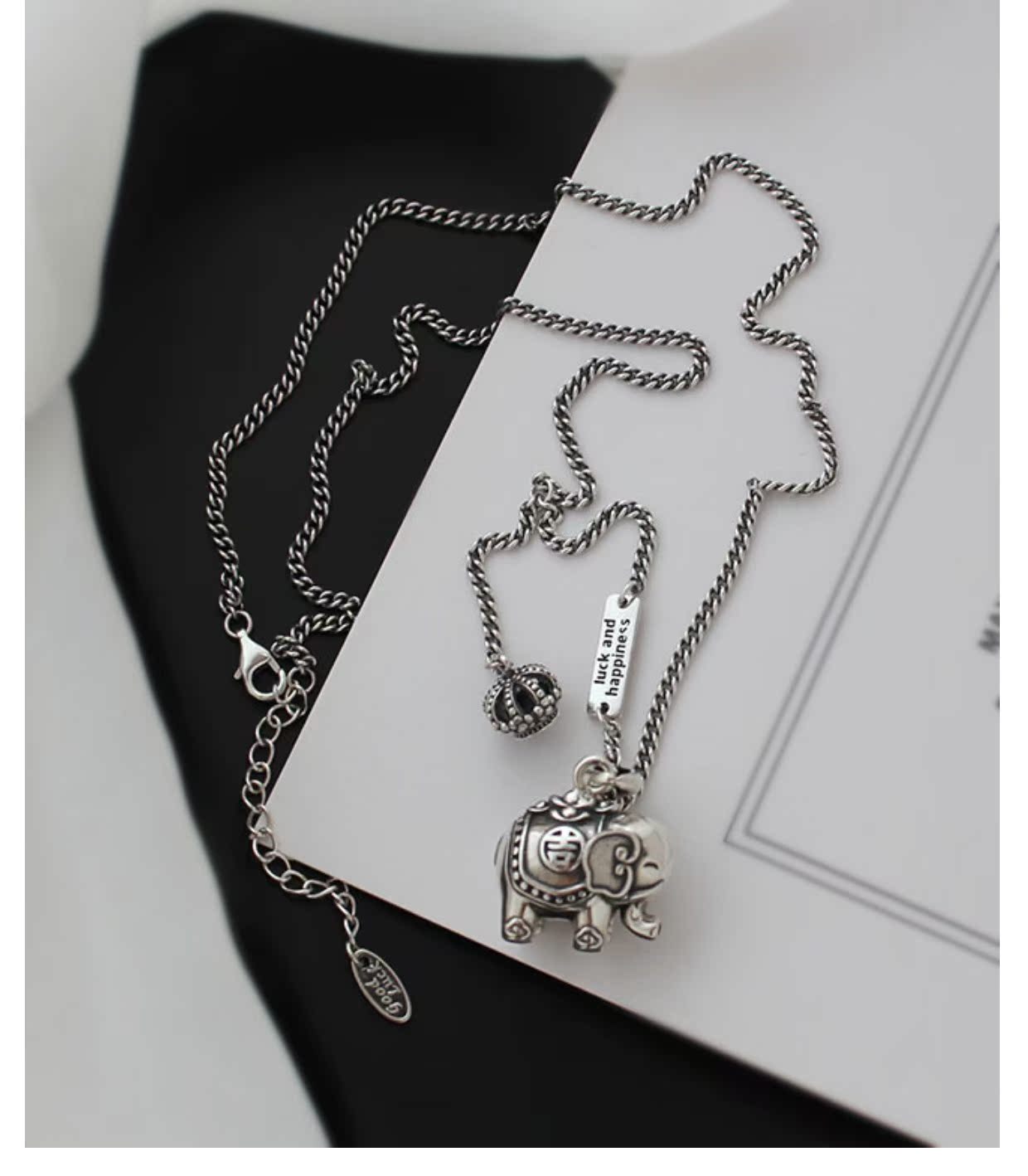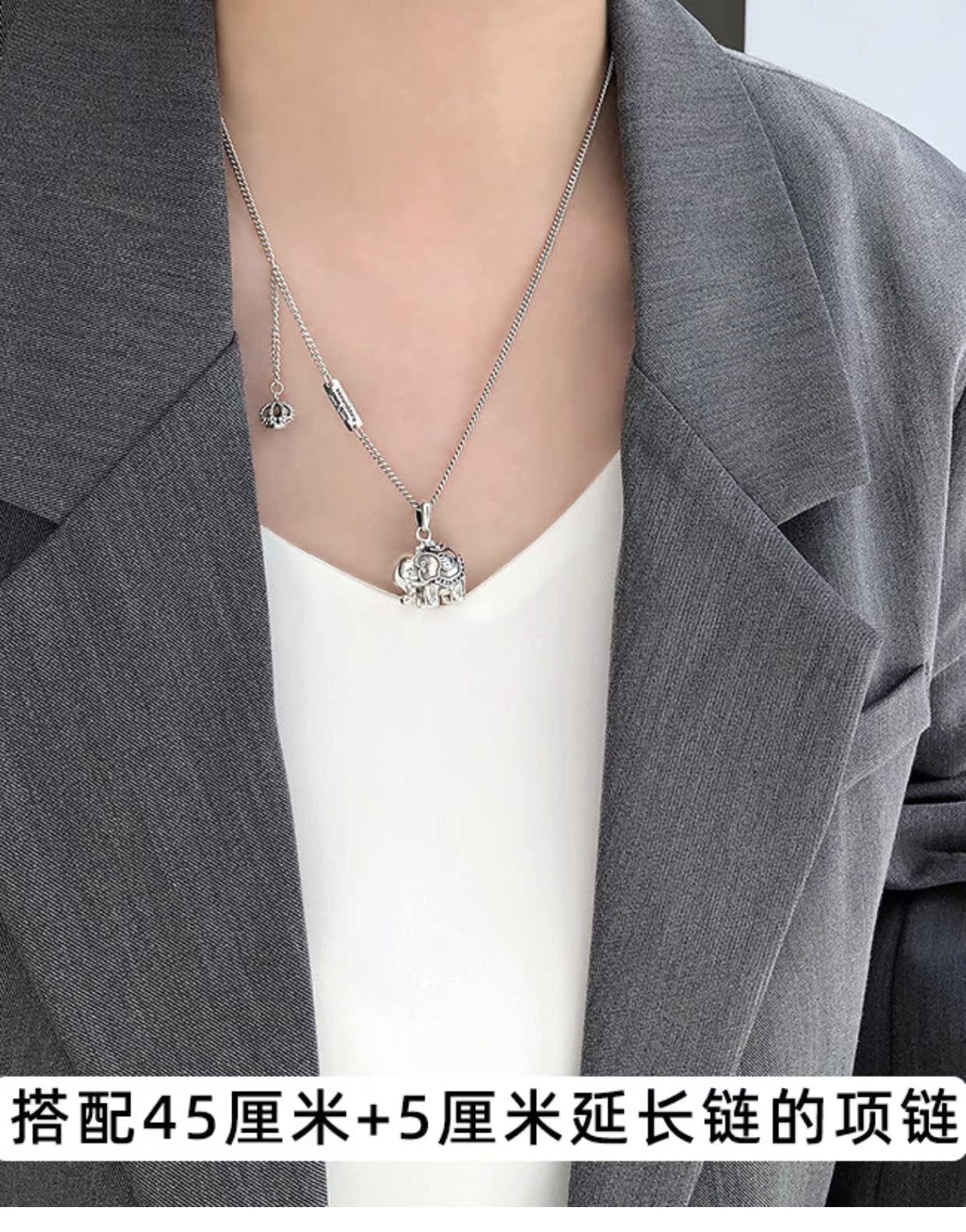 925純銀復古做舊立體大象項鏈皇冠毛衣鏈男女款個性時尚潮流吊墜