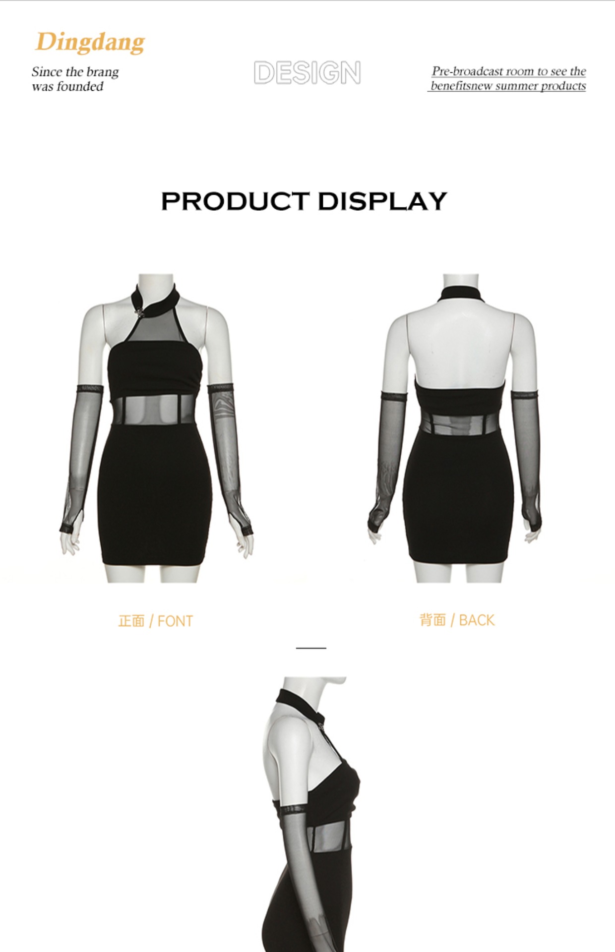 KLIOU 性感辣妹風黑色網紗拼接掛脖露肩連衣裙女修身顯身材包臀裙