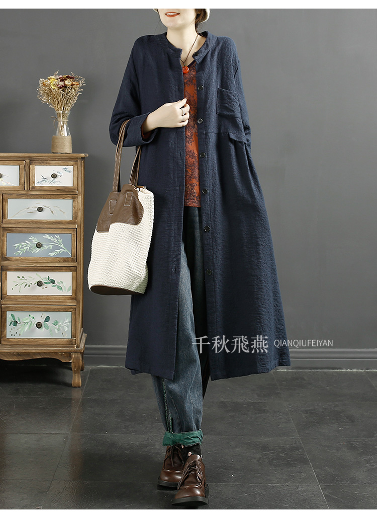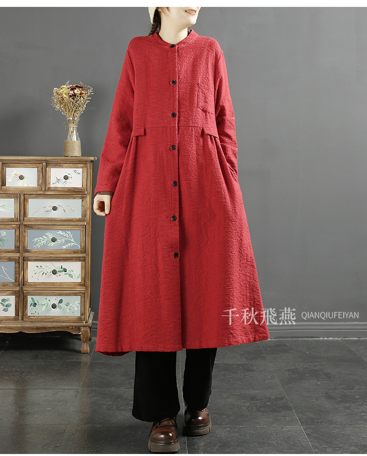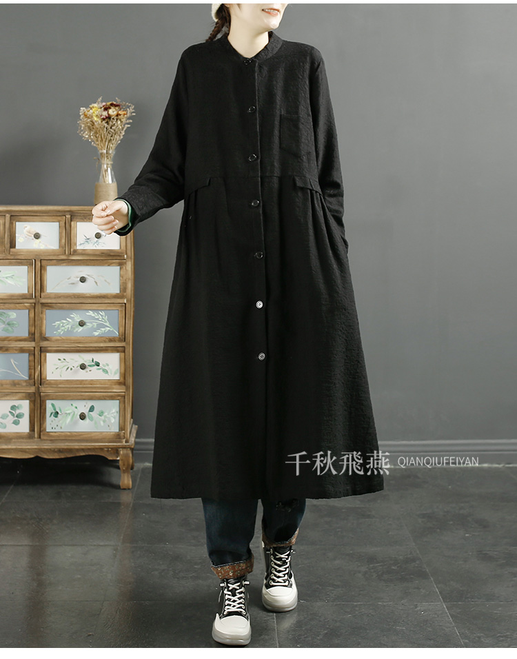 千秋飛燕復古純色提花褶皺立領連衣裙秋季新款減齡遮肚單排扣風衣