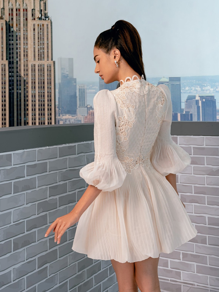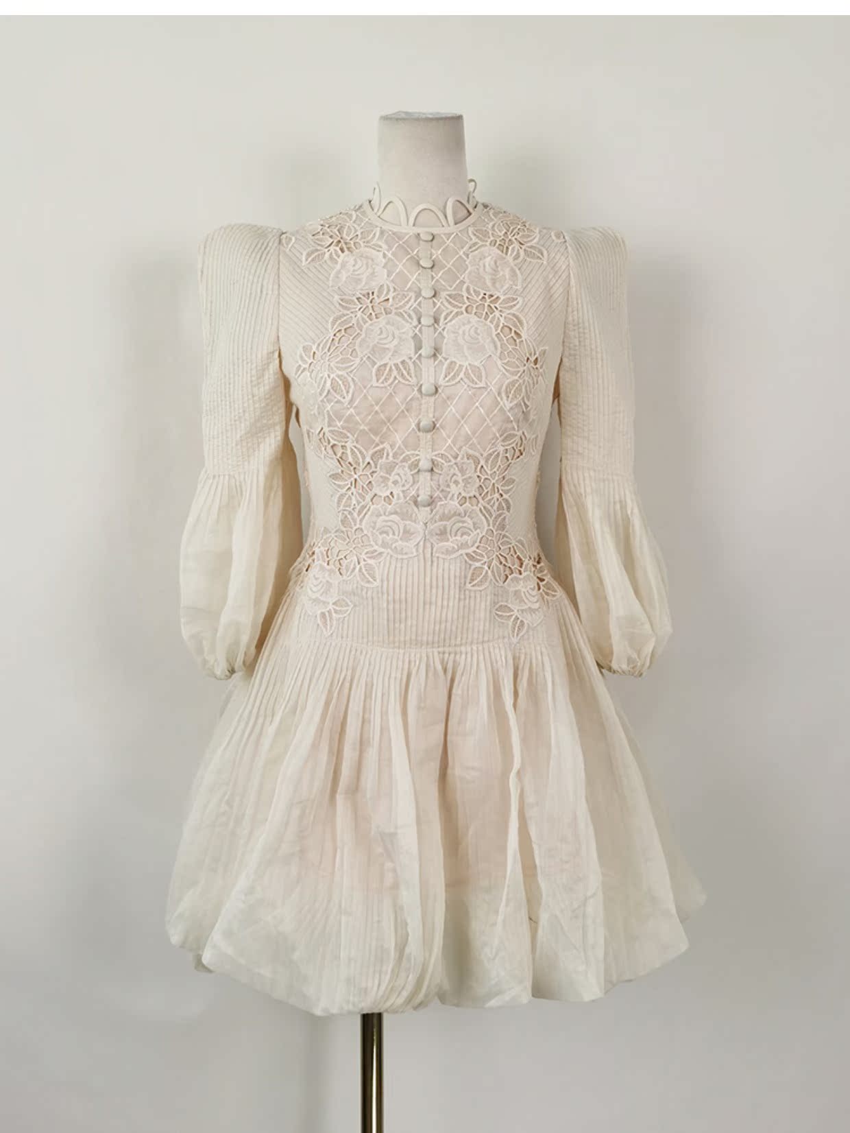 越南設計師氣質蕾絲刺繡白色蓬蓬短裙小眾輕奢泡泡袖燈籠裙連衣裙