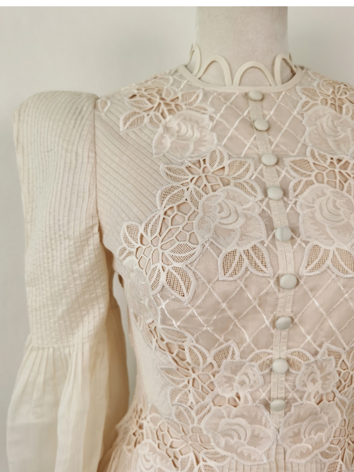 越南設計師小眾輕奢甜美氣質短裙重工立體花朵網紗鏤空蕾絲連衣裙