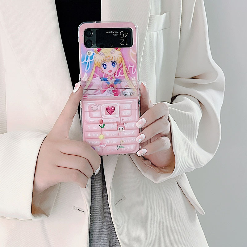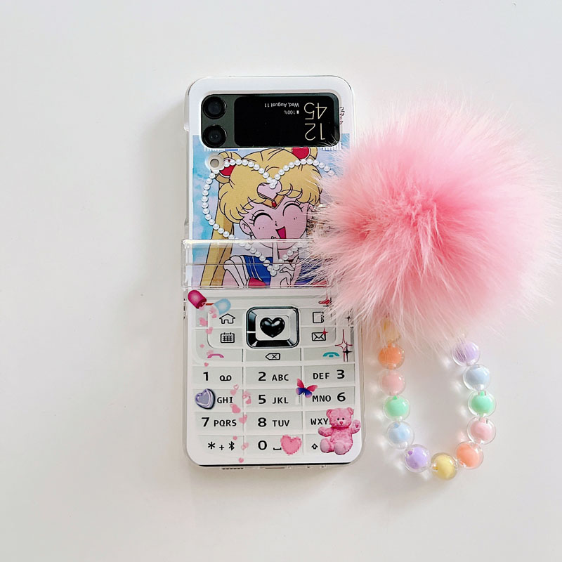 適用三星zflip5手機殼可愛卡通搞怪功能按鍵手機美少女戰士硬zlip4保護套新款zflip 3殼折疊屏手提短手繩毛球