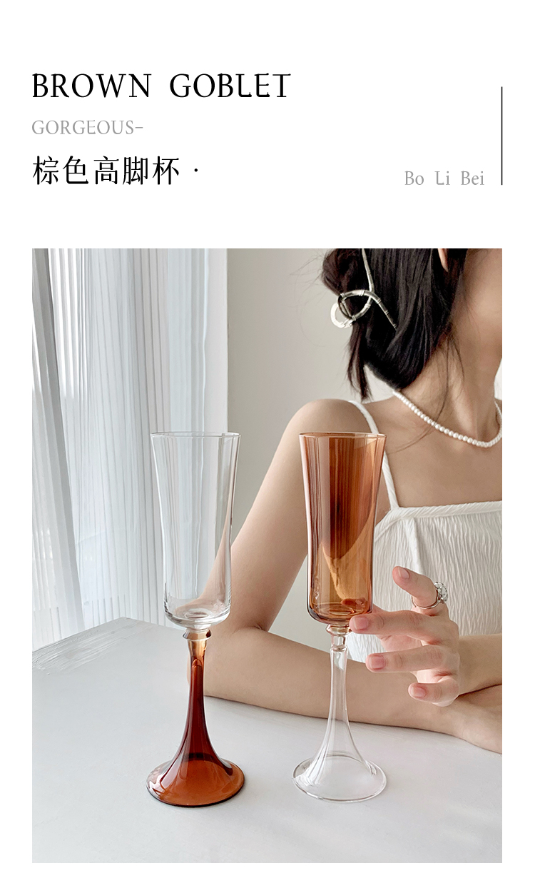 Qumin 法式中古琥珀色高腳杯高級感宮廷風條紋葡萄酒杯香檳玻璃杯