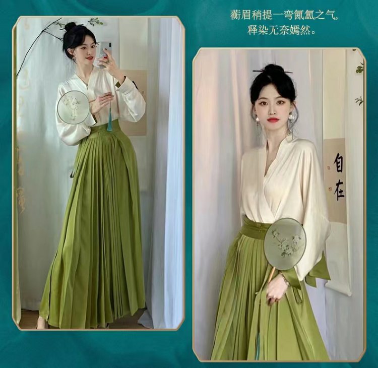 改良漢服女成人中國風日常現代裝清雅綠色仙氣長干寺百迭裙套裝秋