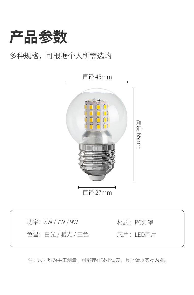 LED超亮燈泡三色變光家用螺口5瓦7W吊燈E27透明小圓球泡魔豆節能