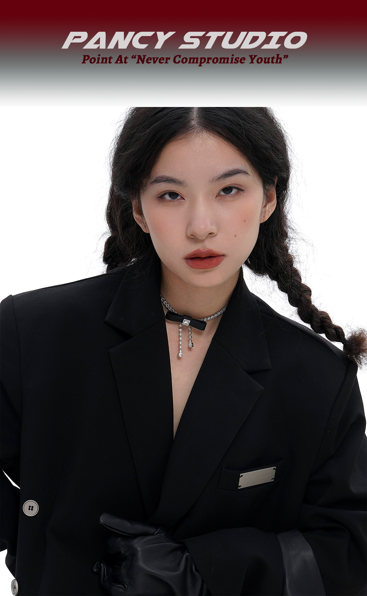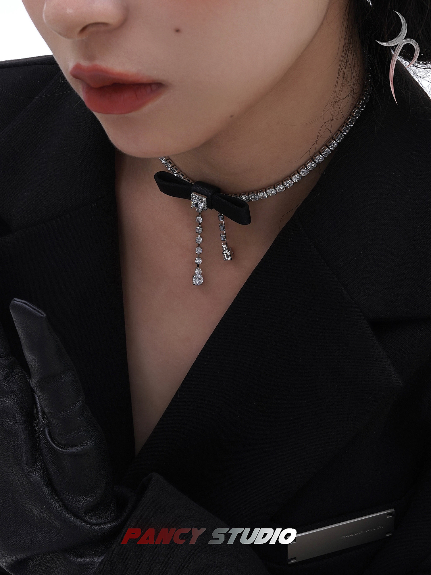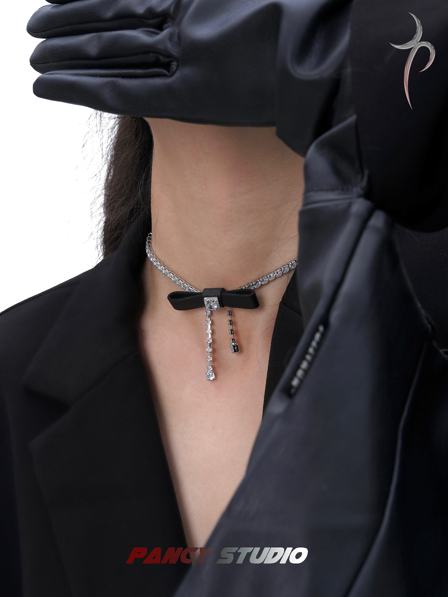 PANCY滿鉆皮質黑蝴蝶結項圈項鏈百搭頸飾千金名媛風頸帶choker