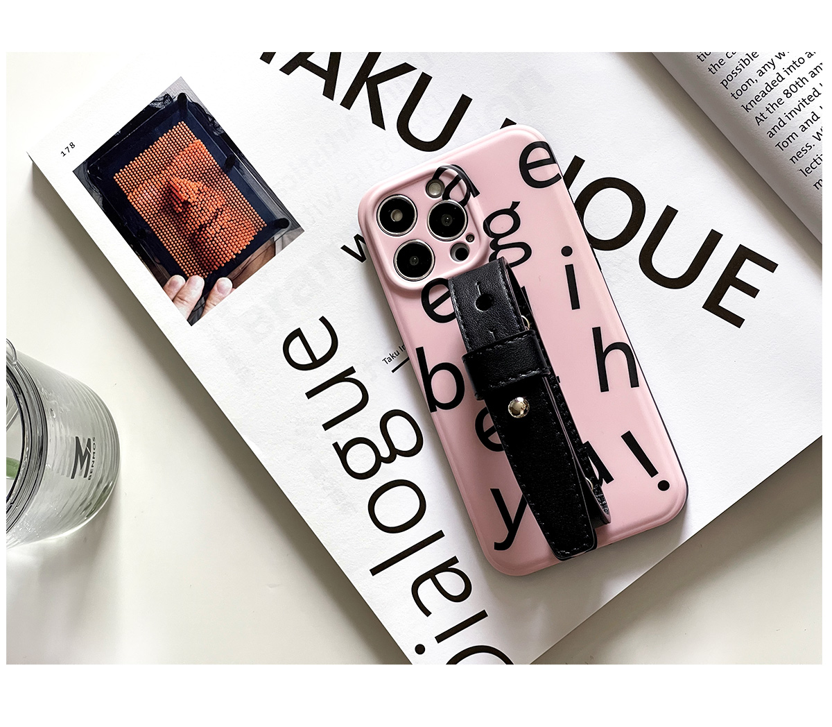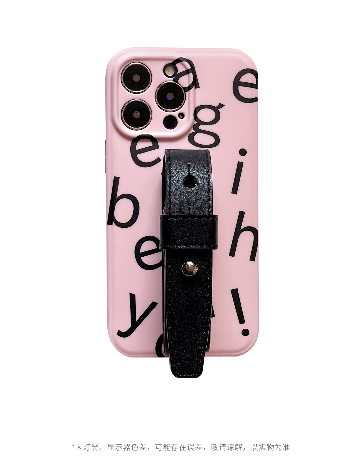 ins淺粉底字母黑豆豆手腕適用于蘋果14/13pro植糅牛皮手機殼全包