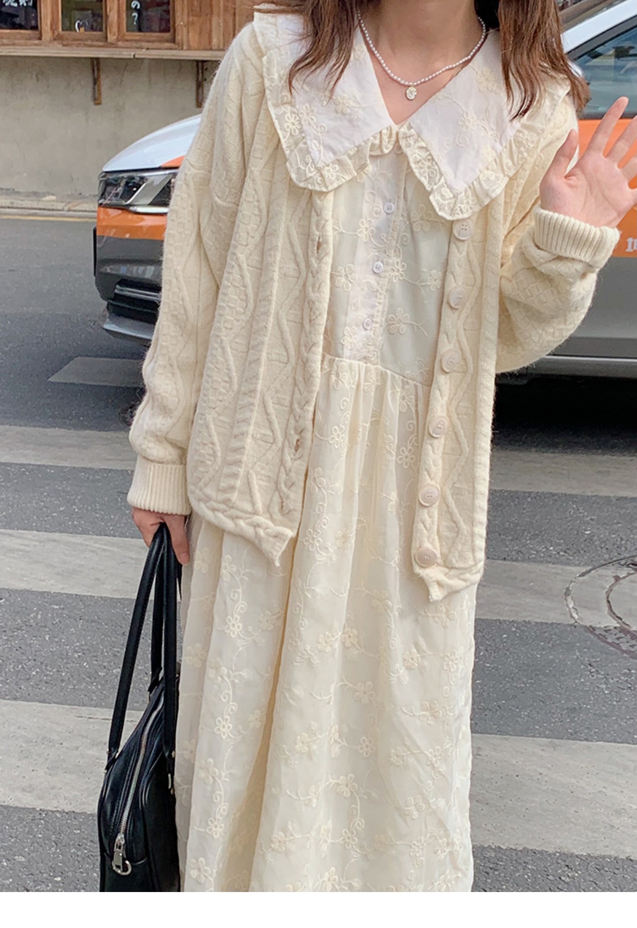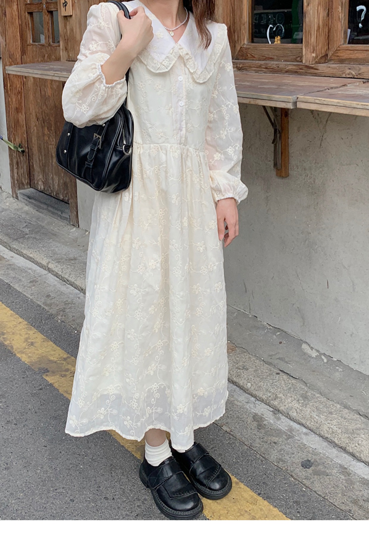 踏進銀河 日系甜美花邊娃娃領連衣裙小個子中長款溫柔長袖裙子秋